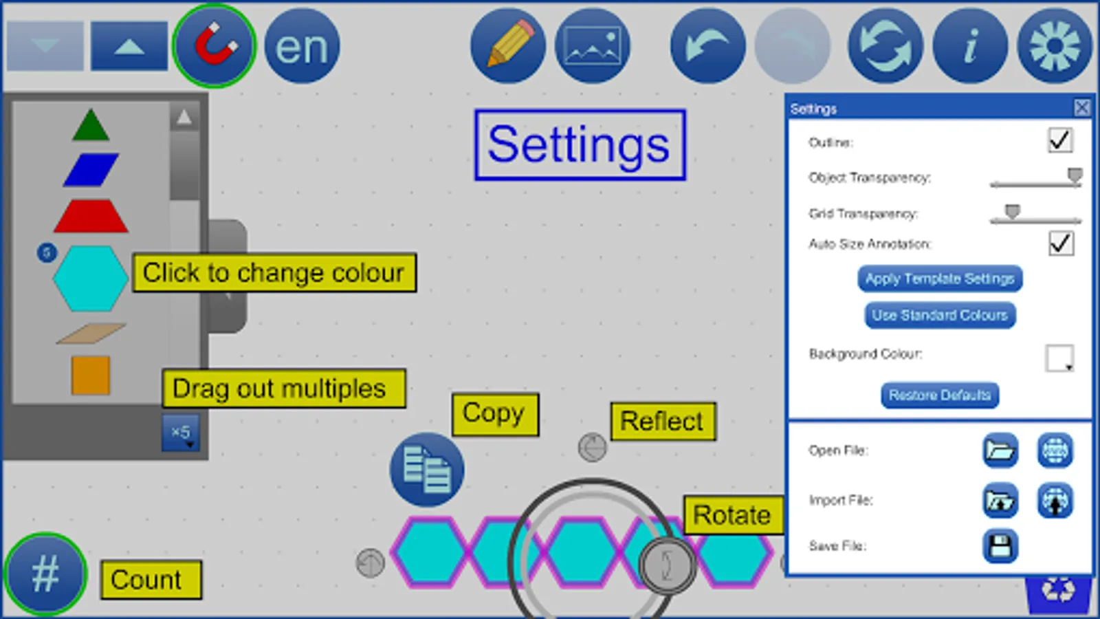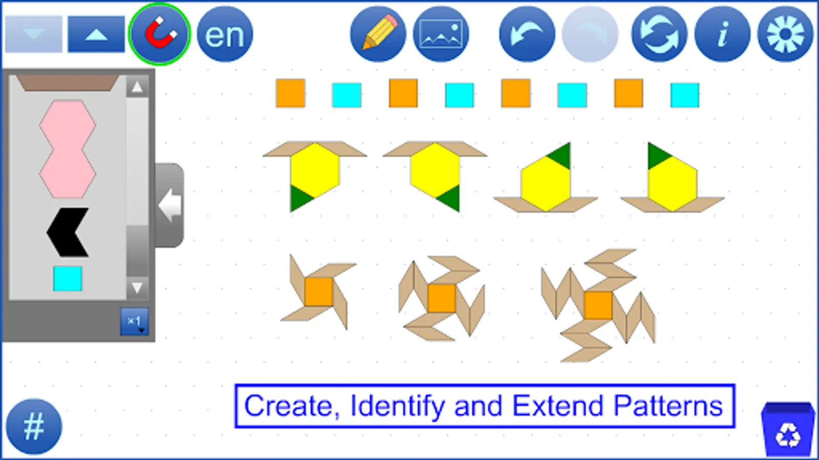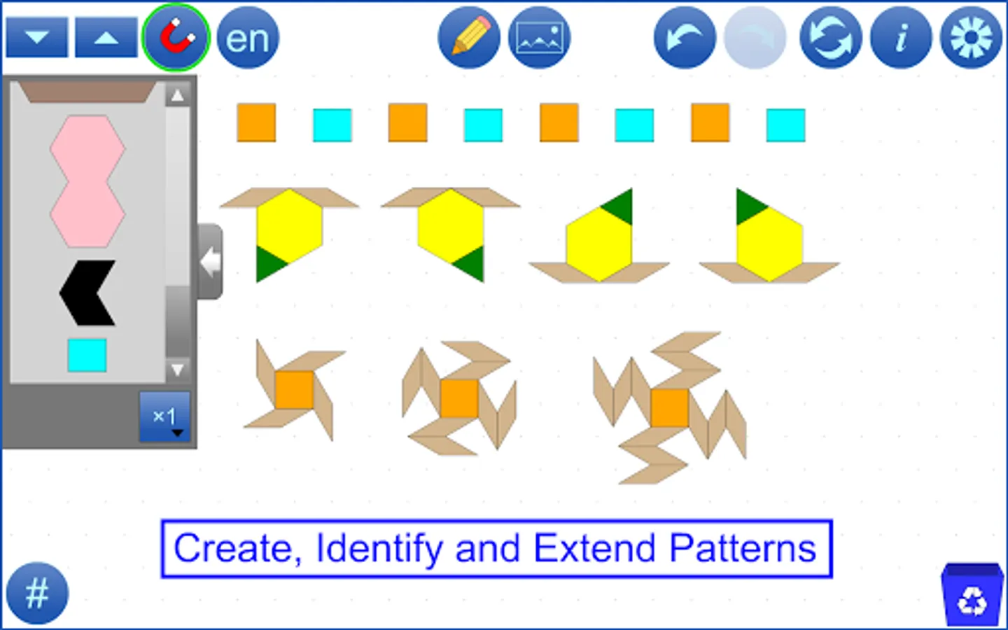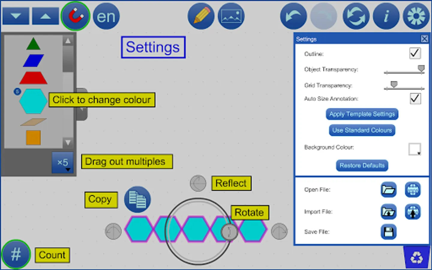 The Pattern Blocks+ Tool is a virtual manipulative similar to the physical ones commonly available in classrooms. Fifteen different shapes can be dragged into the workspace from the scrollable selection panel at the left. Once in the workspace they can be moved, copied, reflected, or rotated, individually or in groups. Blocks to represent tenths are included. The colour of each type of block can be changed. Blocks can be used to create designs and develop numerous mathematical concepts.