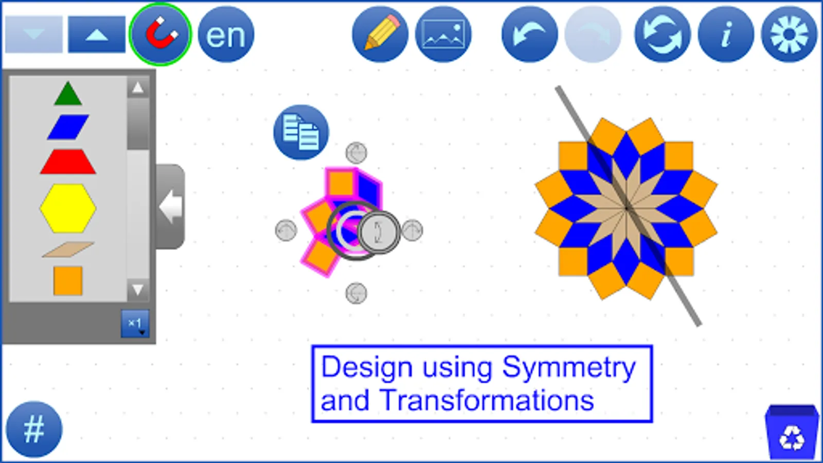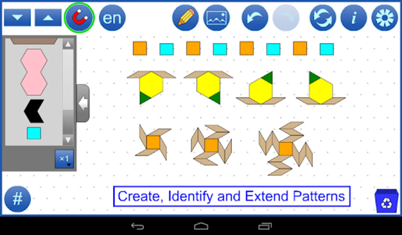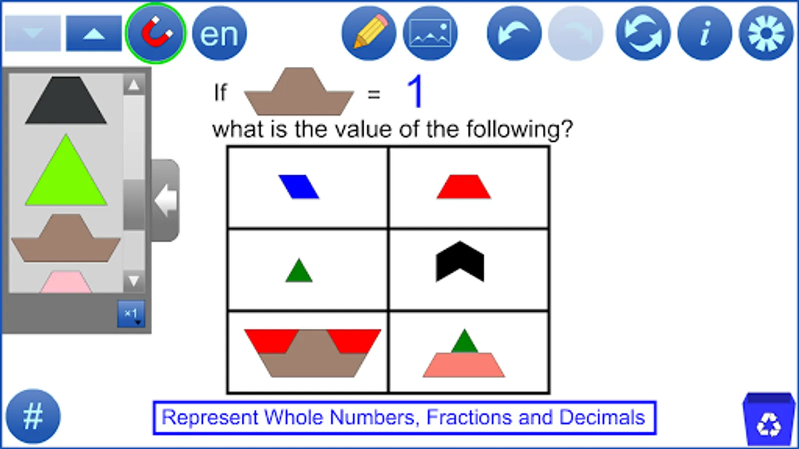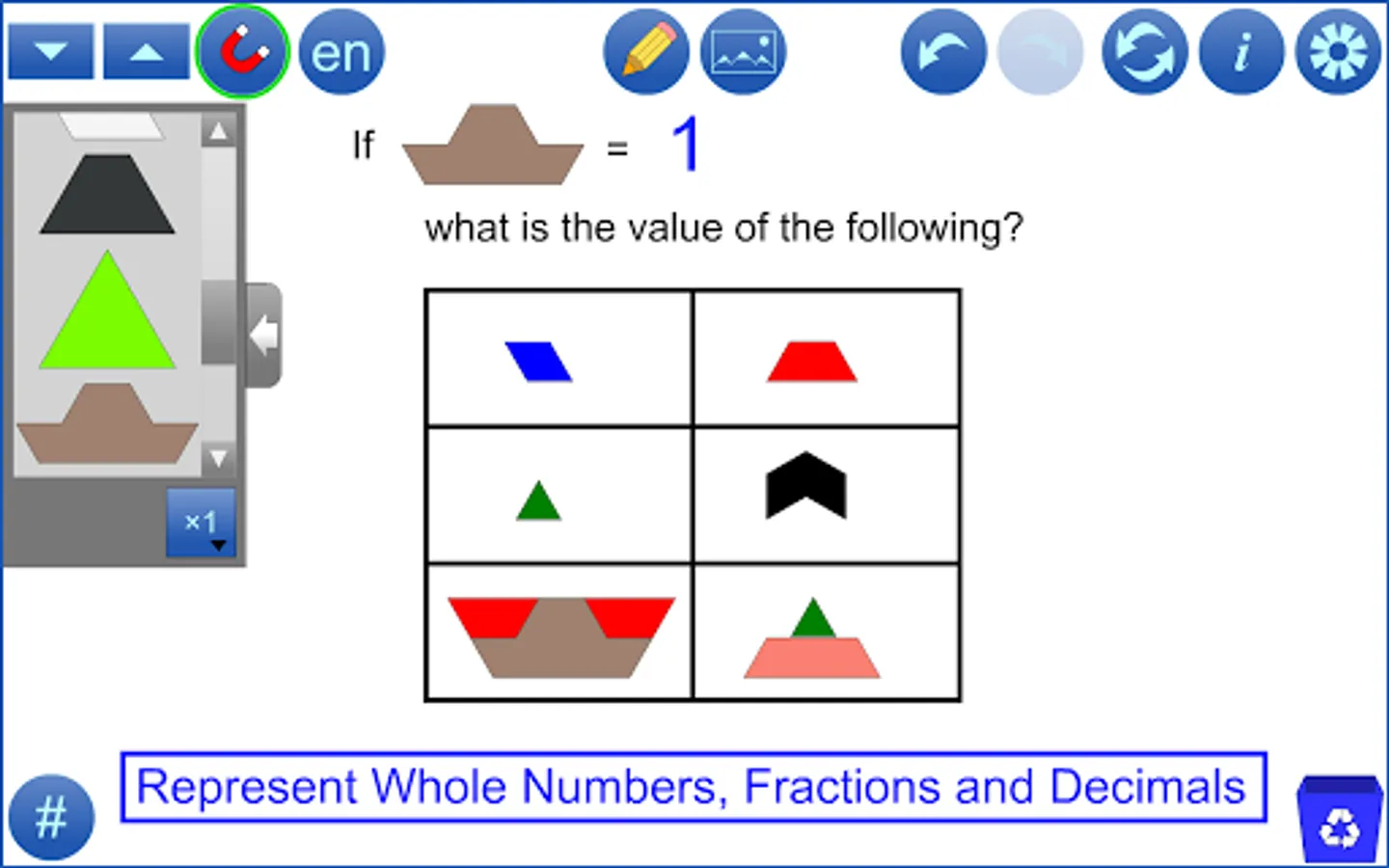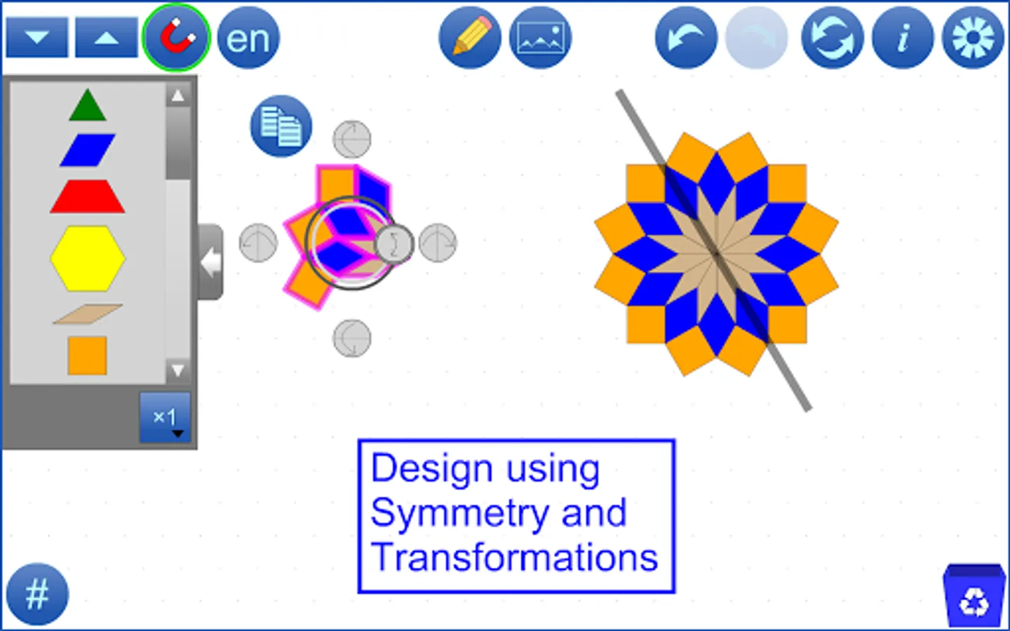The Pattern Blocks+ Tool is a virtual manipulative similar to the physical ones commonly available in classrooms. Fifteen different shapes can be dragged into the workspace from the scrollable selection panel at the left. Once in the workspace they can be moved, copied, reflected, or rotated, individually or in groups. Blocks to represent tenths are included. The colour of each type of block can be changed. Blocks can be used to create designs and develop numerous mathematical concepts.