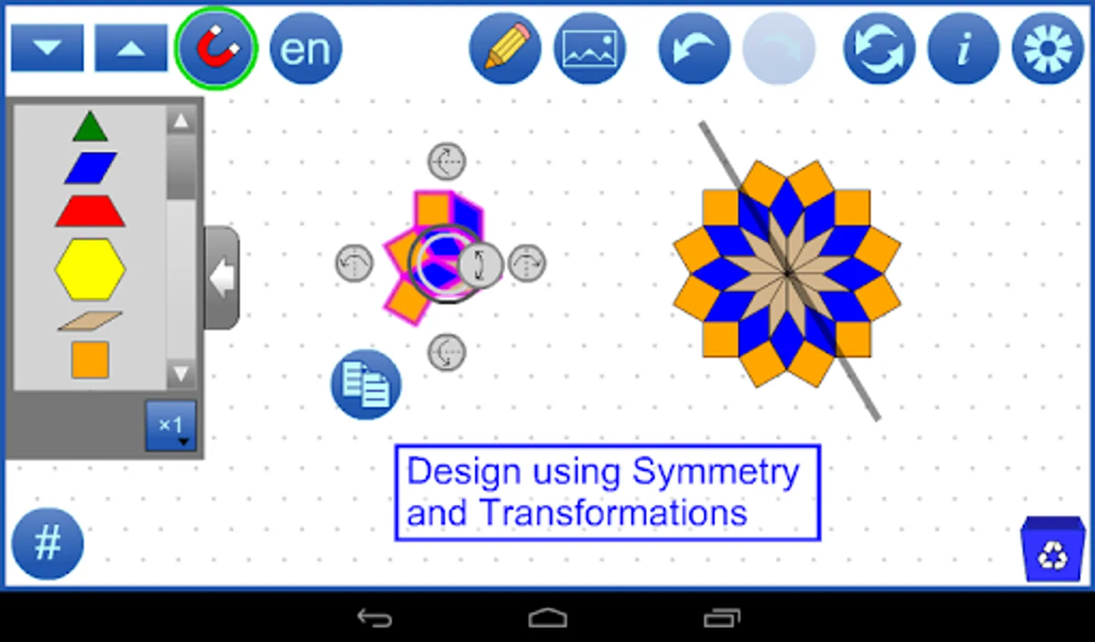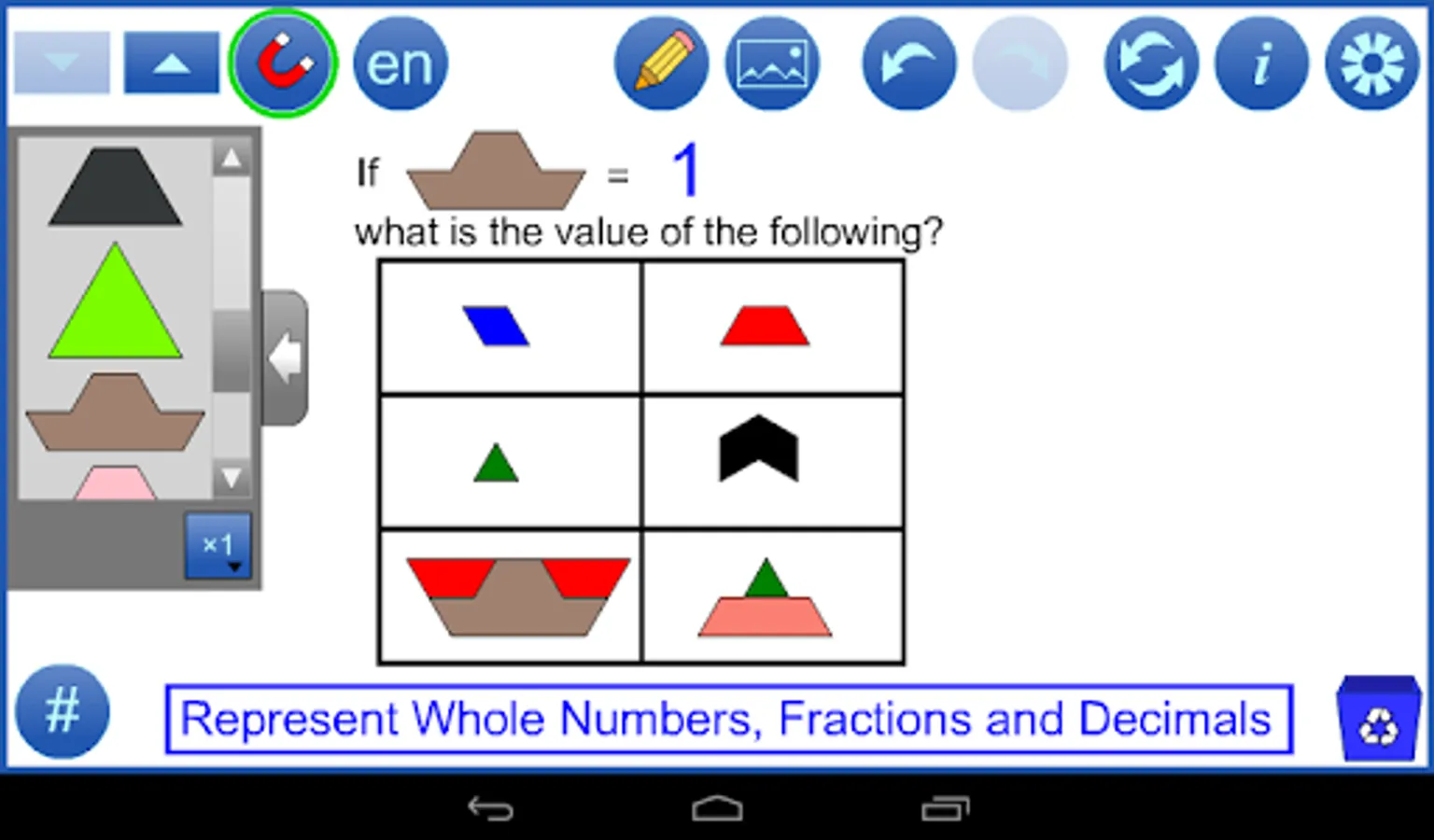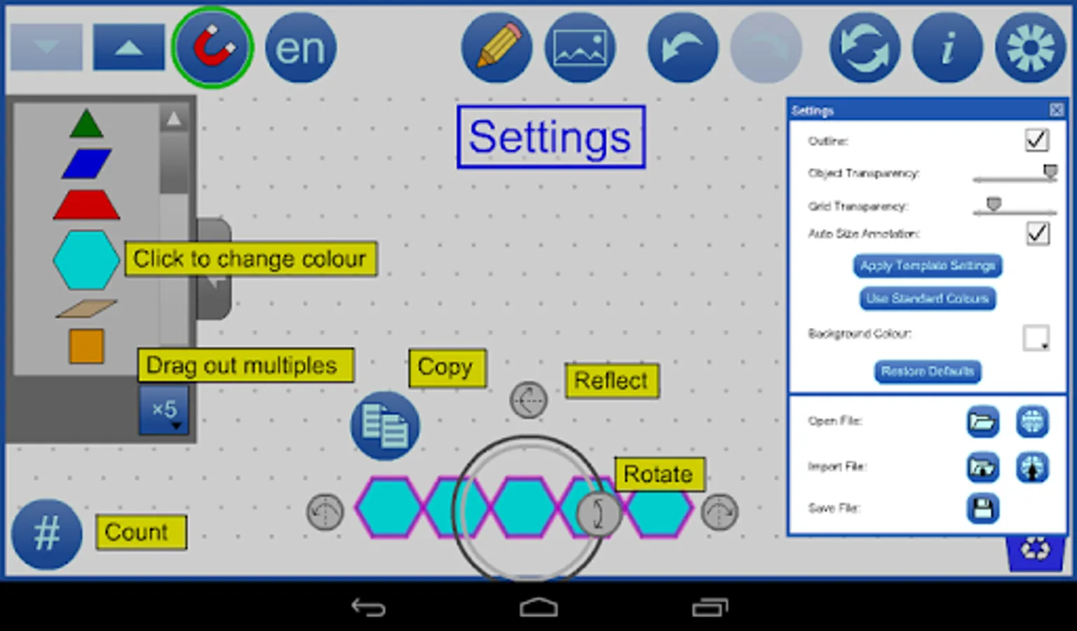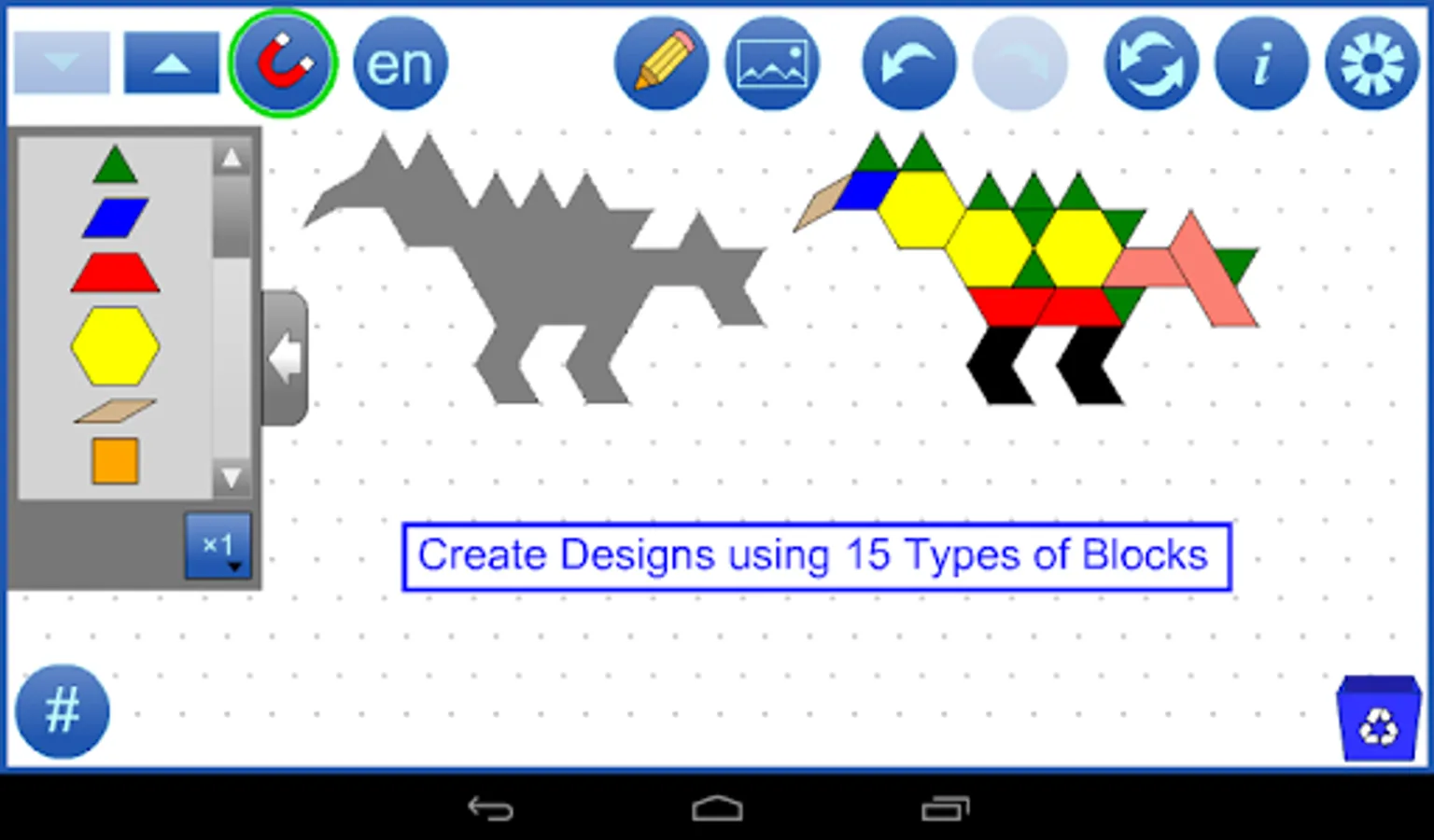 The Pattern Blocks+ Tool is a virtual manipulative similar to the physical ones commonly available in classrooms. Fifteen different shapes can be dragged into the workspace from the scrollable selection panel at the left. Once in the workspace they can be moved, copied, reflected, or rotated, individually or in groups. Blocks to represent tenths are included. The colour of each type of block can be changed. Blocks can be used to create designs and develop numerous mathematical concepts.