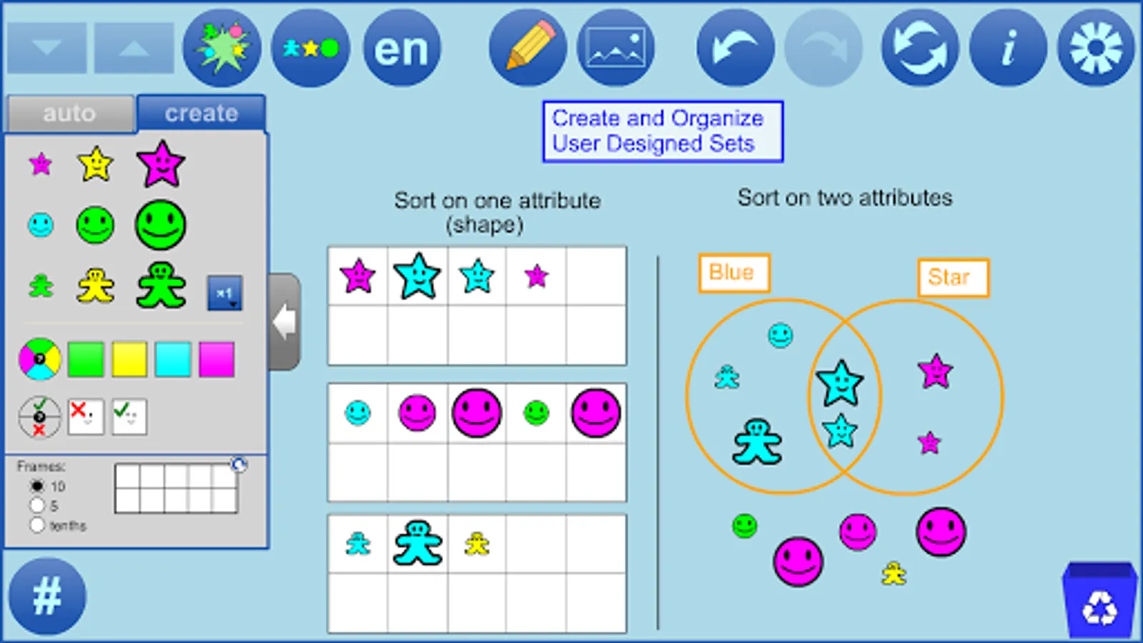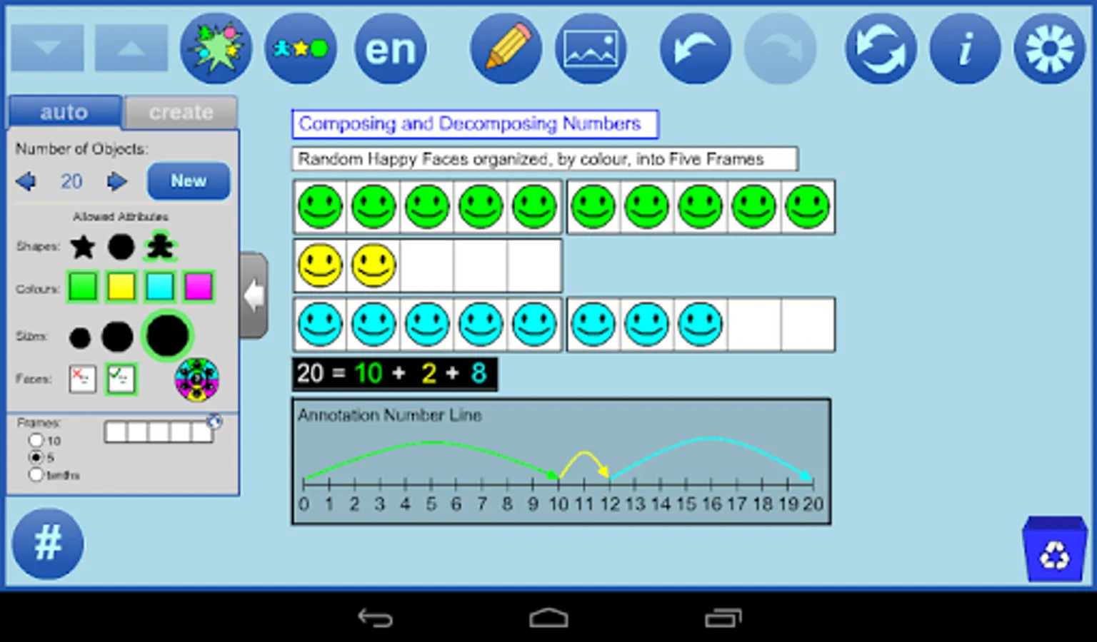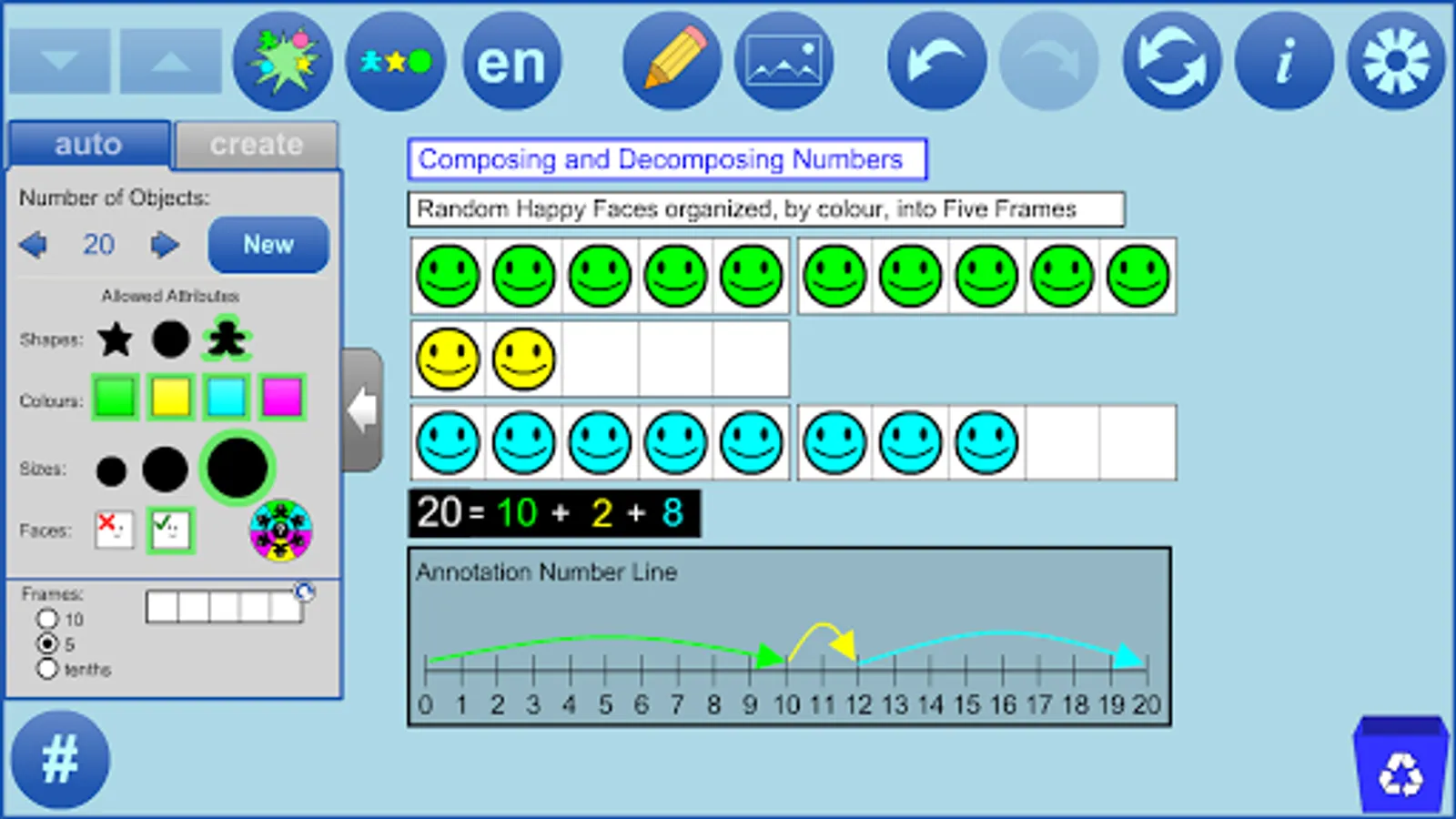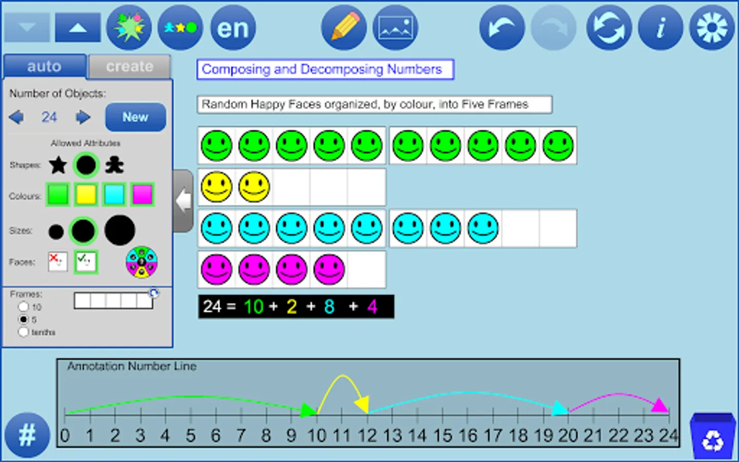 Sets of objects can be generated randomly or designed by the user. Sort and classify objects. Create patterns. Represent, compose and decompose whole numbers, tenths, and fractions. Explore experimental probability.