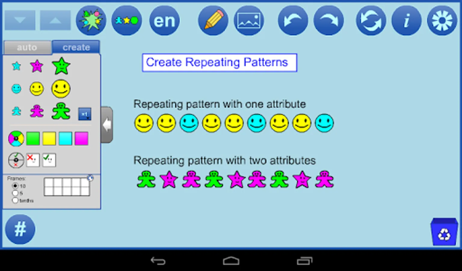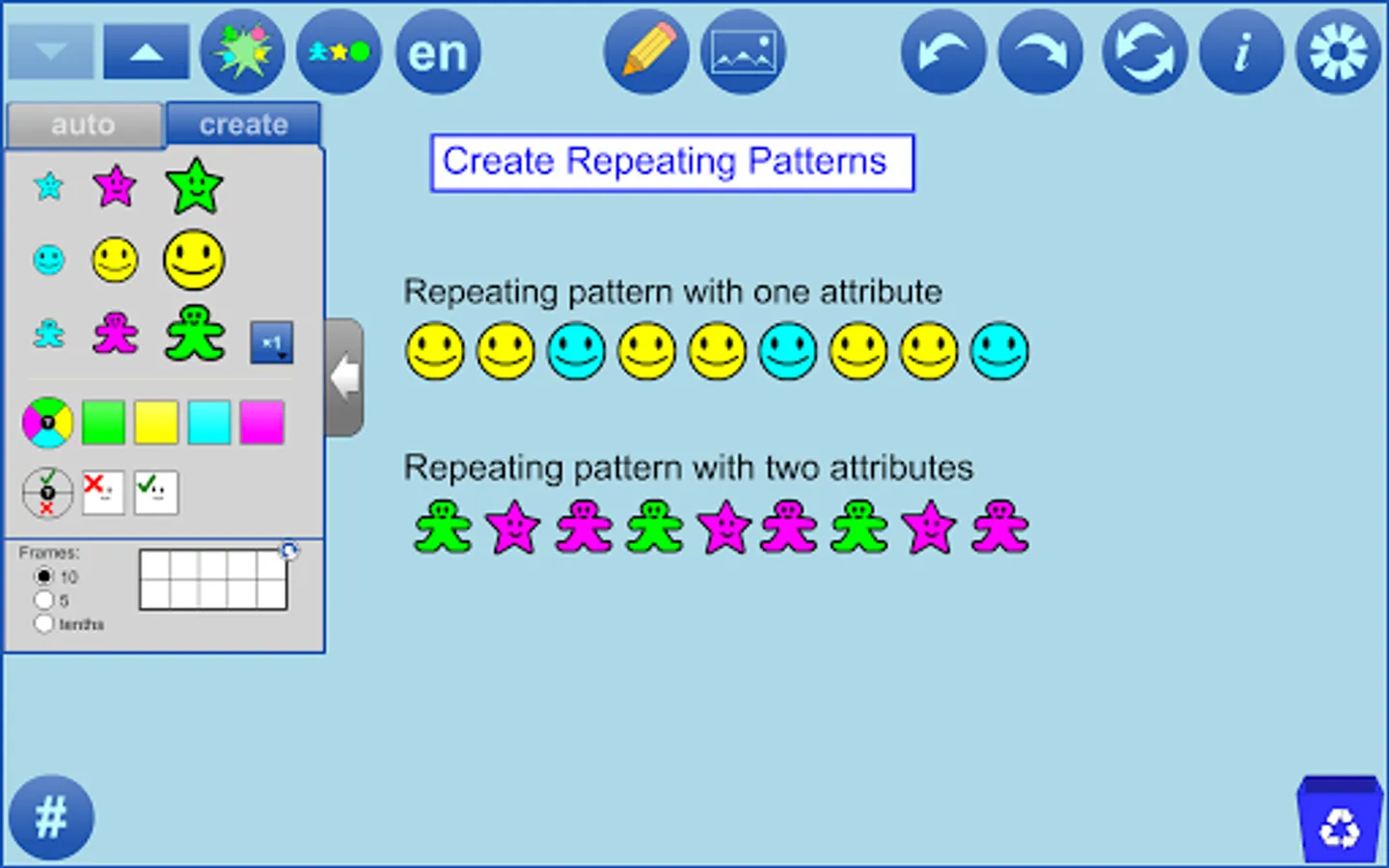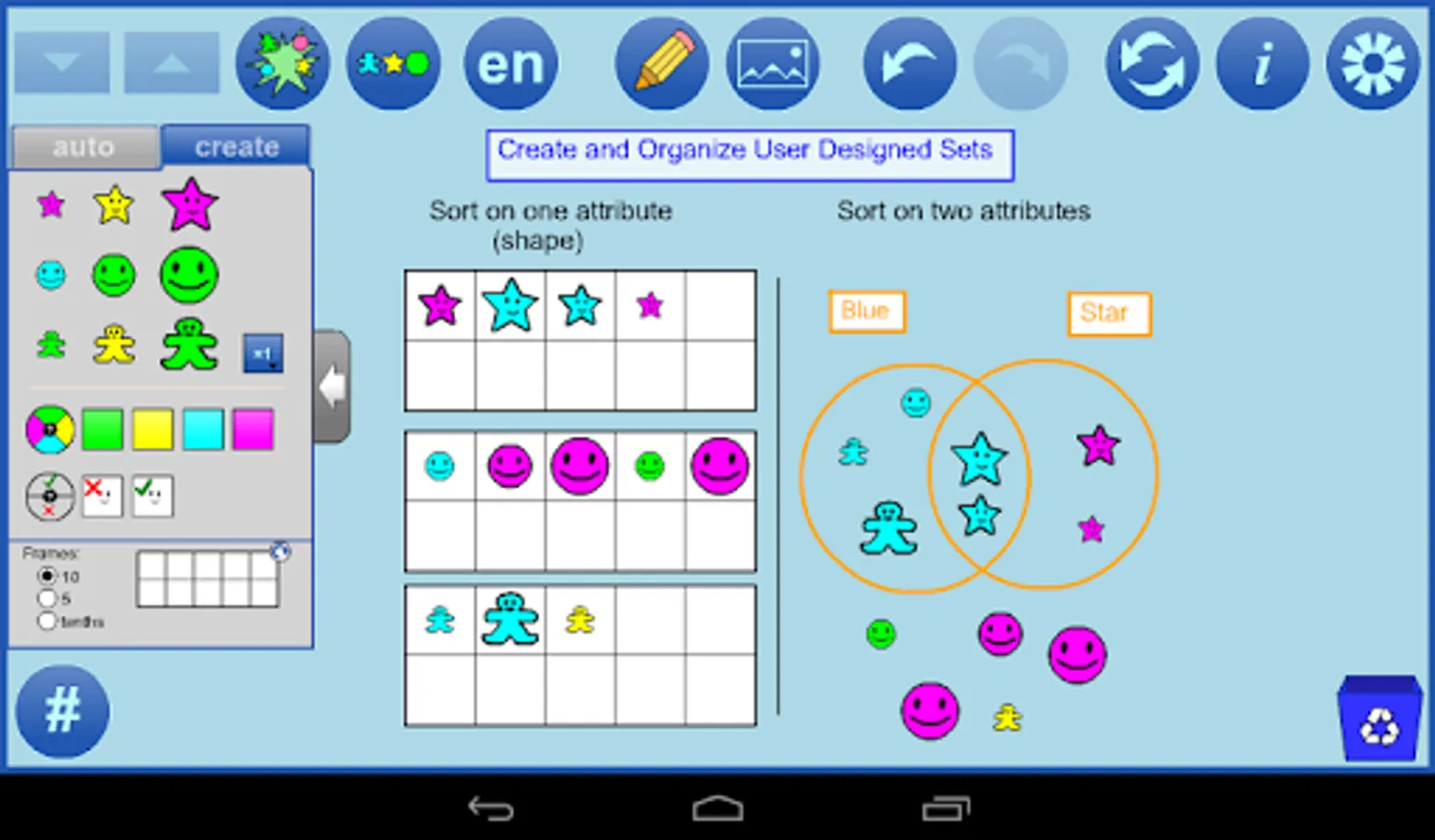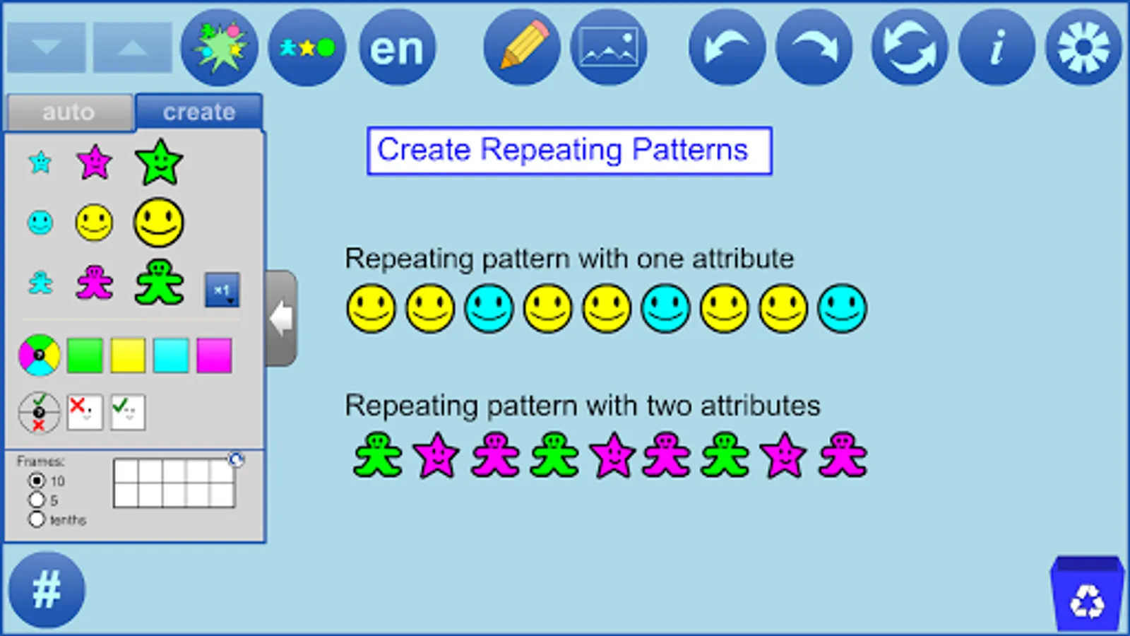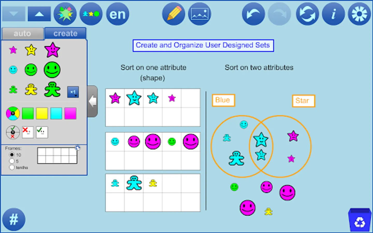 Sets of objects can be generated randomly or designed by the user. Sort and classify objects. Create patterns. Represent, compose and decompose whole numbers, tenths, and fractions. Explore experimental probability.