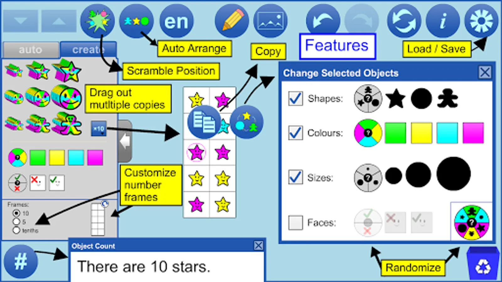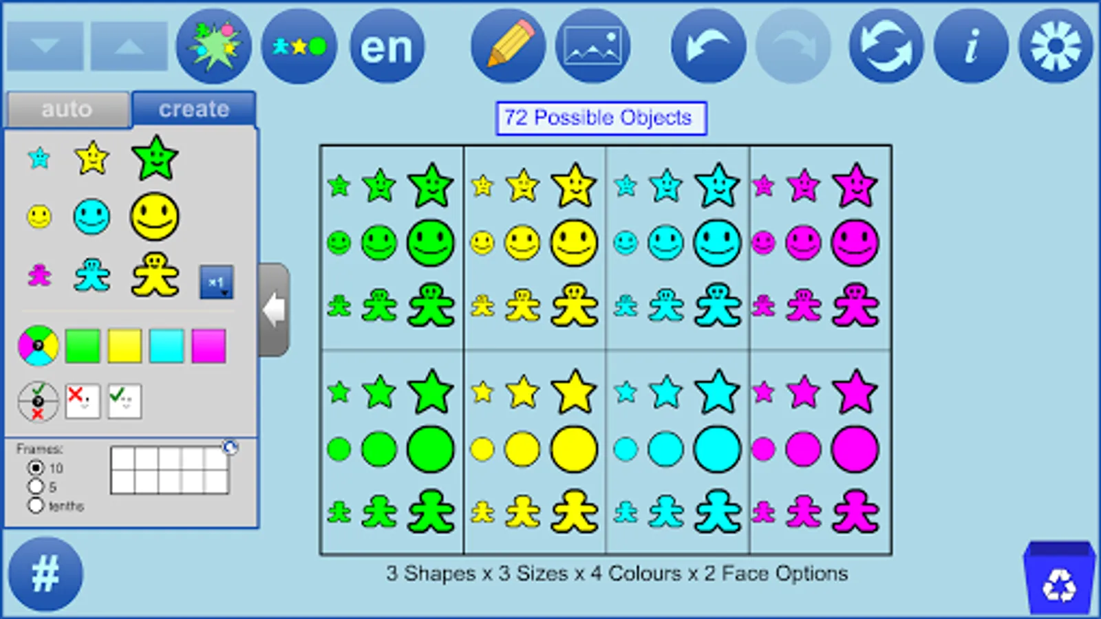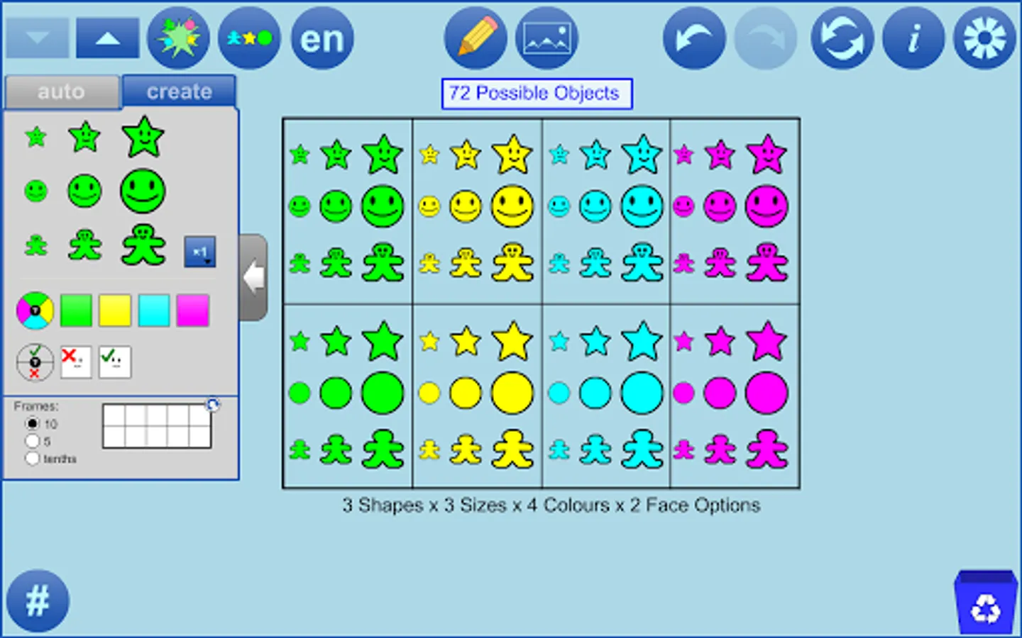 • Change the attributes of selected objects (shape, colour, size, facedness) specifically or randomly