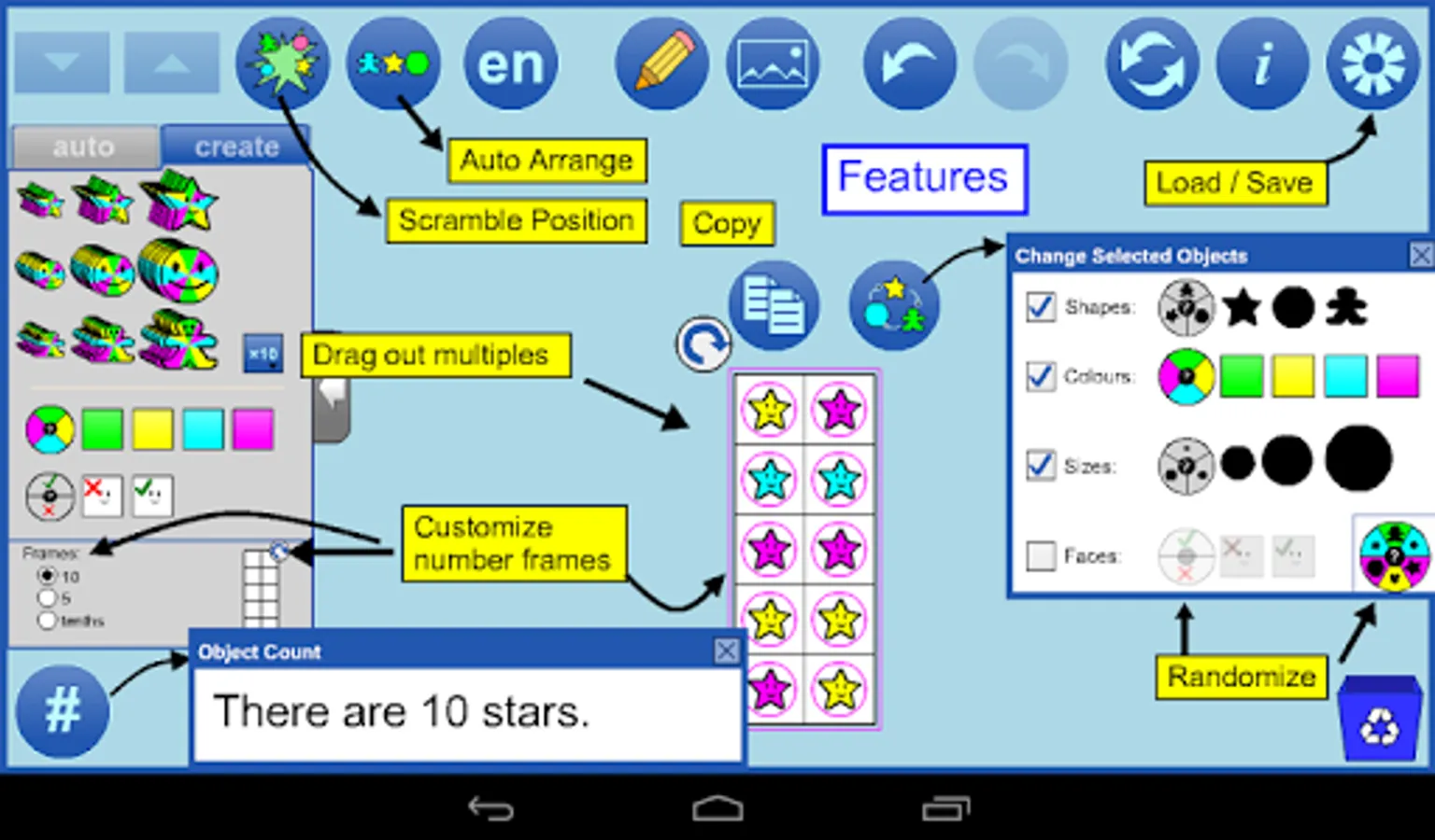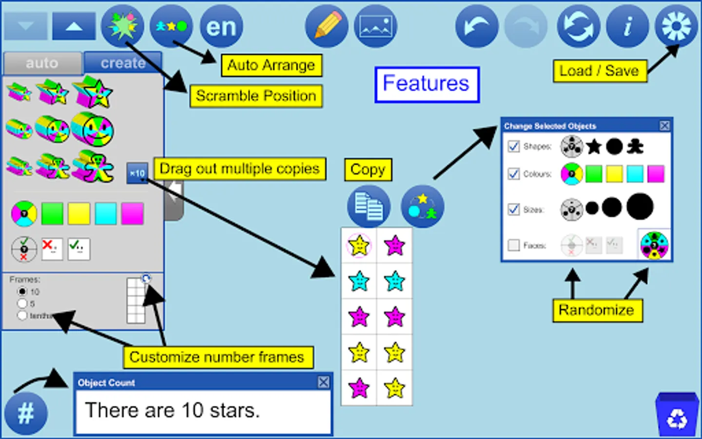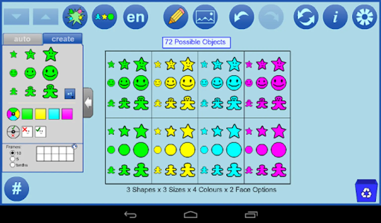 • Change the attributes of selected objects (shape, colour, size, facedness) specifically or randomly