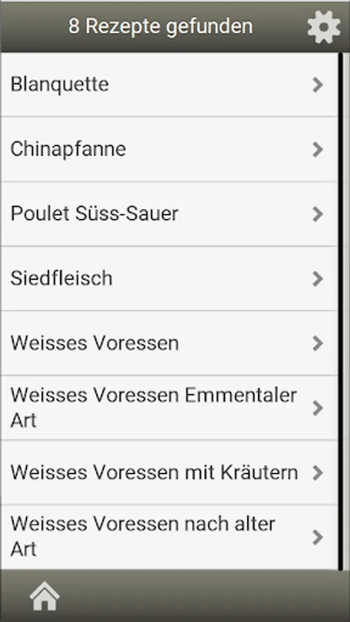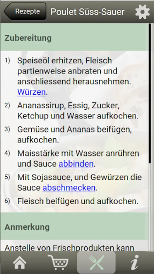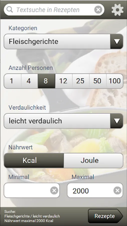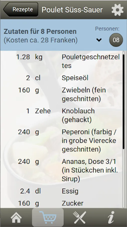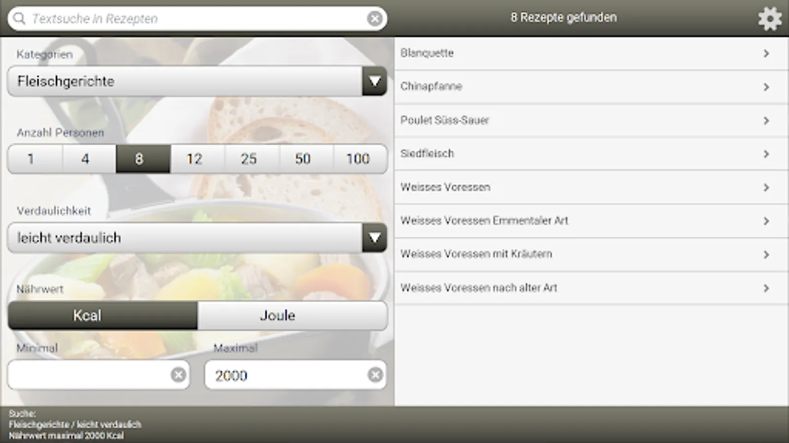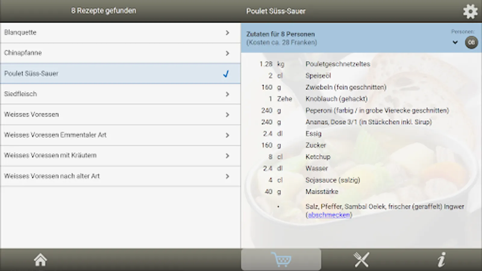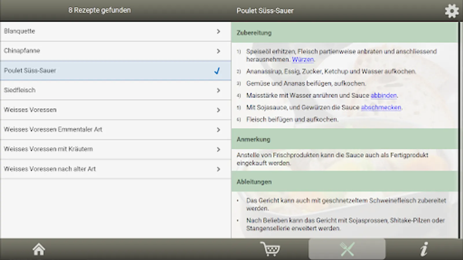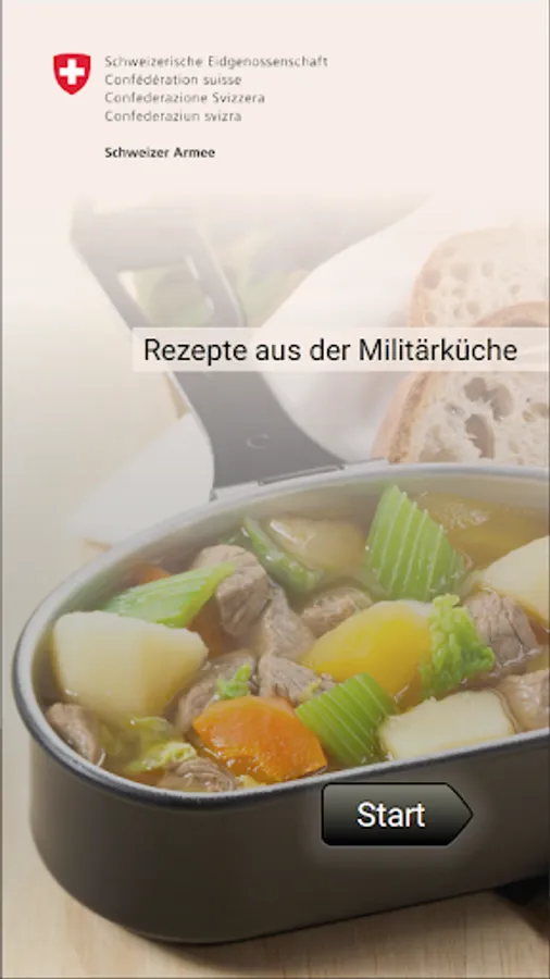 The "receptor" presents delicious recipes from Swiss military cuisine. The search for a suitable recipe is simplified with the search criteria "categories", "number of people", digestibility and nutritional value. The amount of ingredients is extrapolated according to the "number of people". The preparation of the selected recipe is of course also displayed.