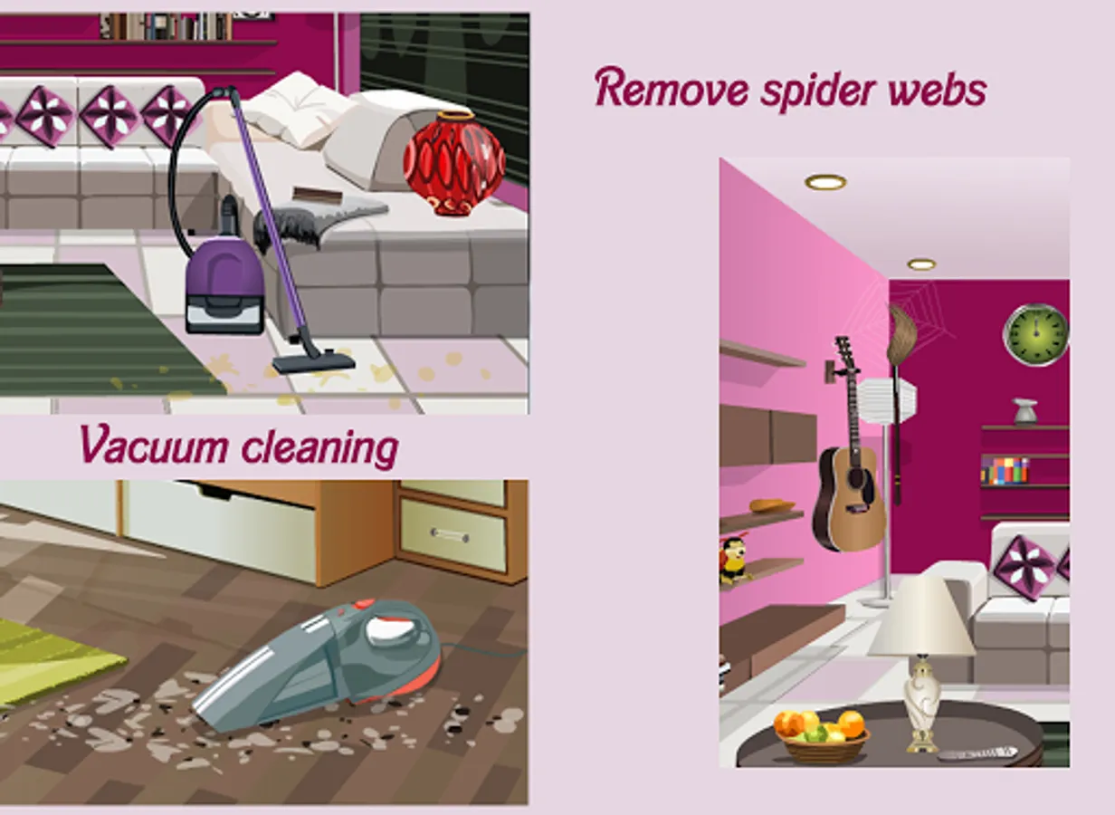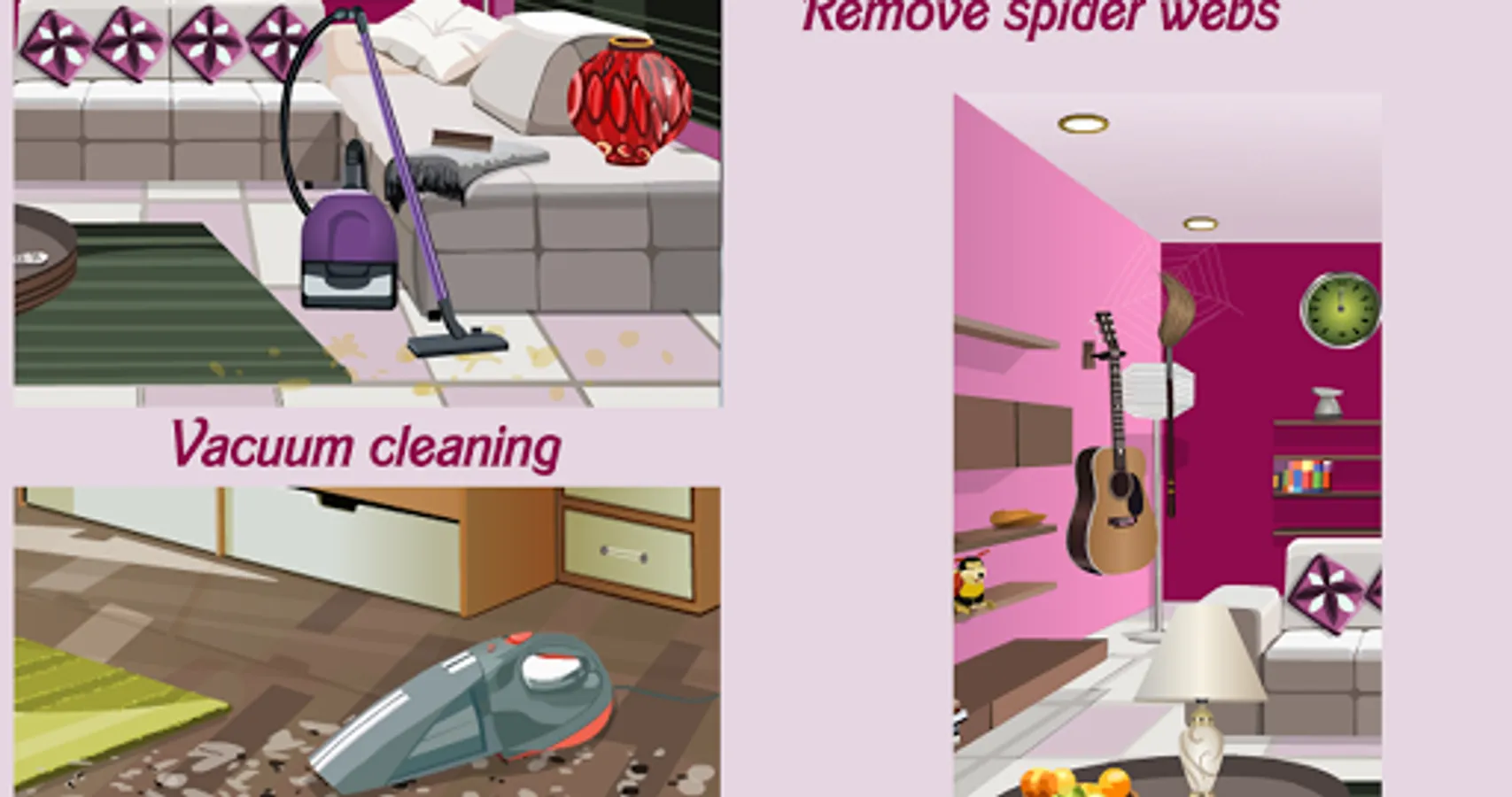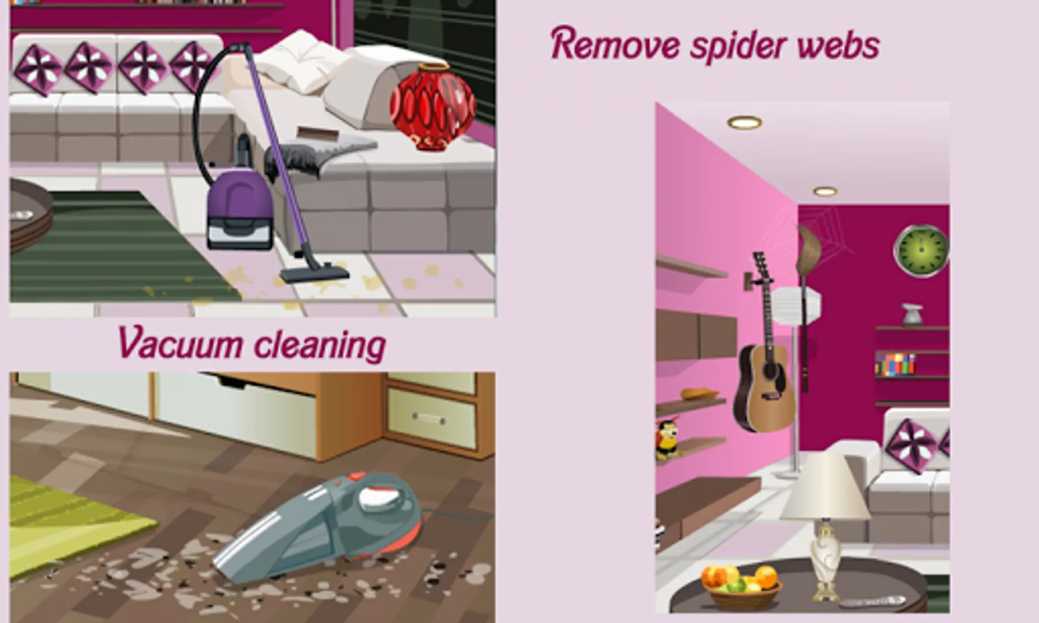 So pitch in and lend a hand for this big clean up job. Tidy the rooms and a things in the house from the living room to the bedroom.