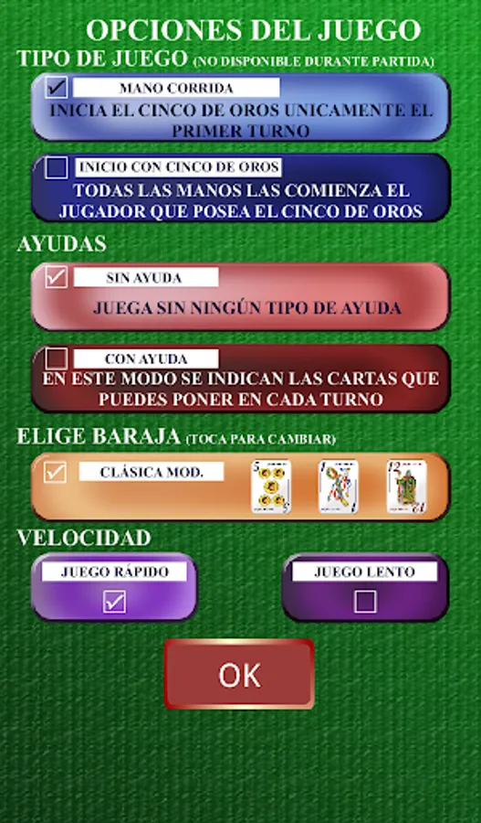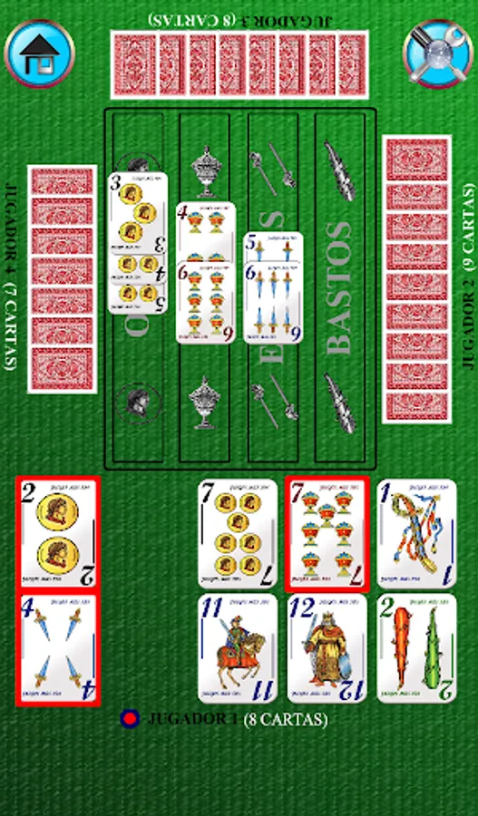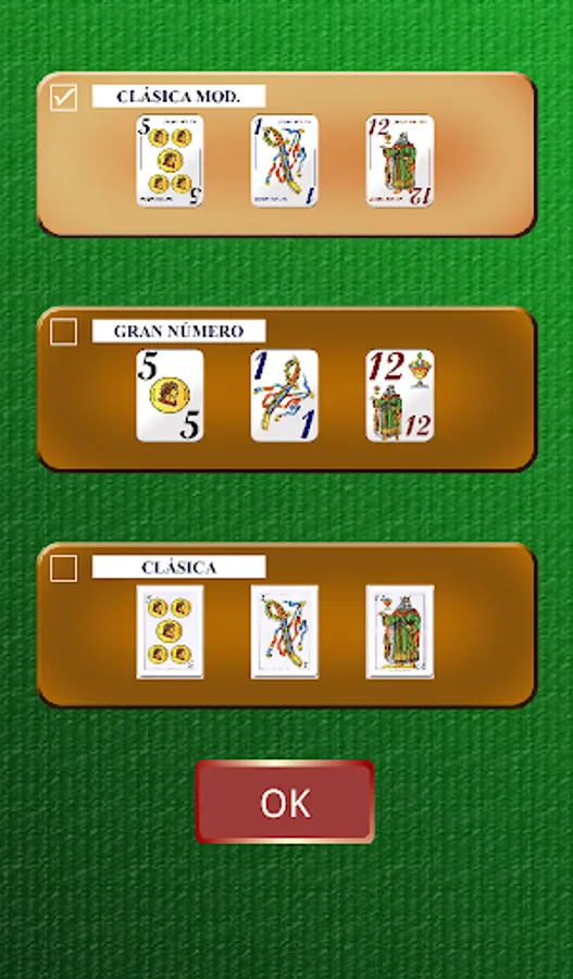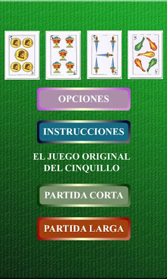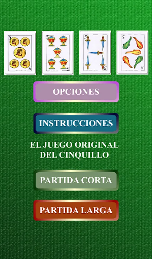 Starts the player with five of golds. Place cards sequentially from the five, upward (King) and down (As). Win the first to run out of cards.