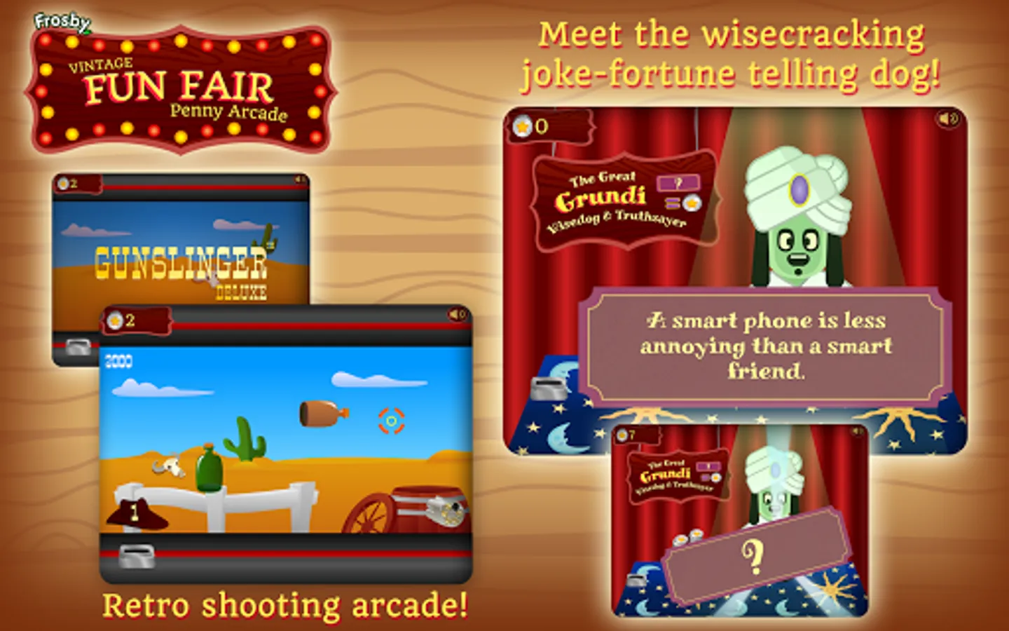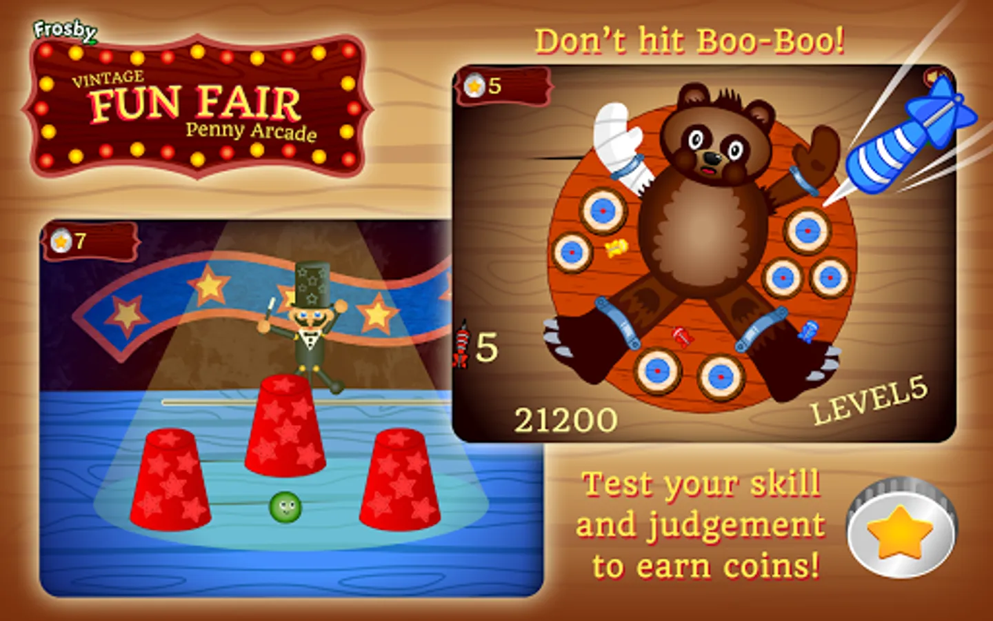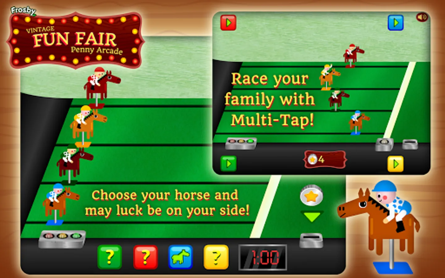 Roll up, roll up, and welcome to Frosby's Funfair Penny Arcade! Old fashioned family entertainment never goes out of fashion, so get your coins ready this summer and have some fun! In this vintage collection of Frosby mini-game classics, there's something for everyone. The app includes 2 racing games, a joke fortune teller, prize claw, retro arcade shooter, dart wheel, spinning cups and a space ducks game! If you like funfair, circus and carnival type games, you've come to the right place!