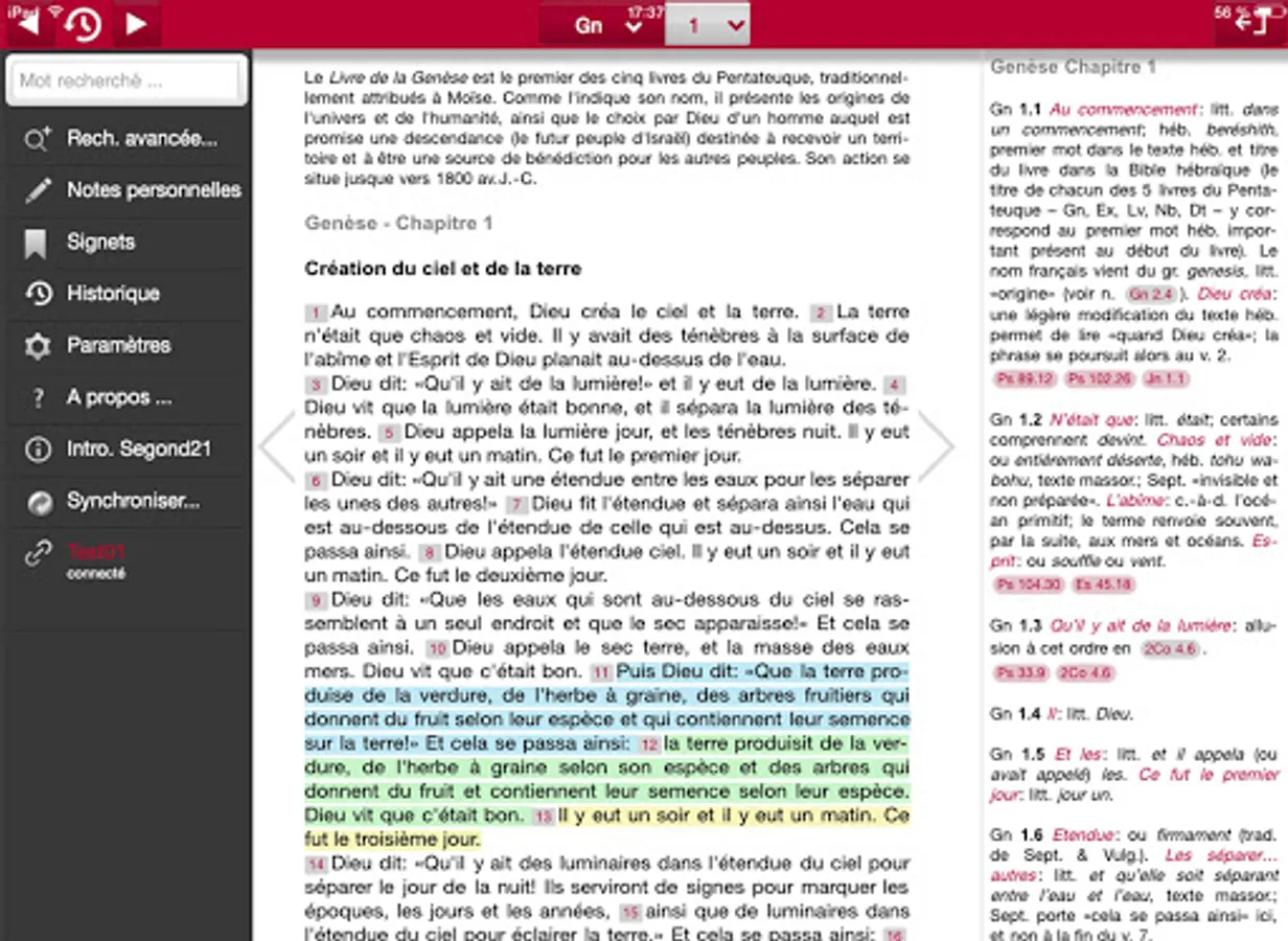 The Bible version used in the application is the Segond 21, published for the first time in 2007 by the Geneva Bible Society after 12 years of work. Its slogan? "The original, with the words of today ': it is faithful to the wording of the original texts while using a common vocabulary in the early 21st century. Available in over 70 printed editions, in all sizes, materials and colors, in all price ranges and for all tastes, it is a great accustomed bestseller FNAC and other large surfaces, and she crossed the threshold of 2,000,000 copies sold, making it the most widespread version Francophonie.