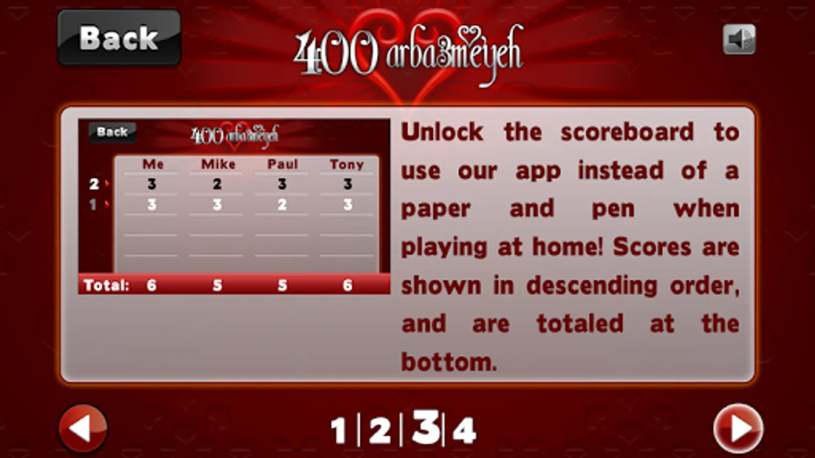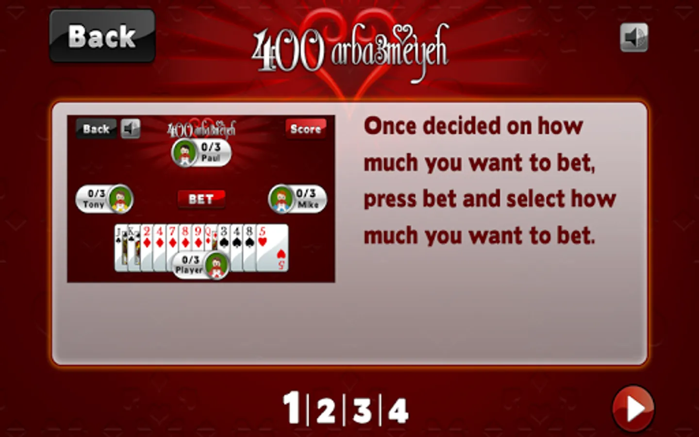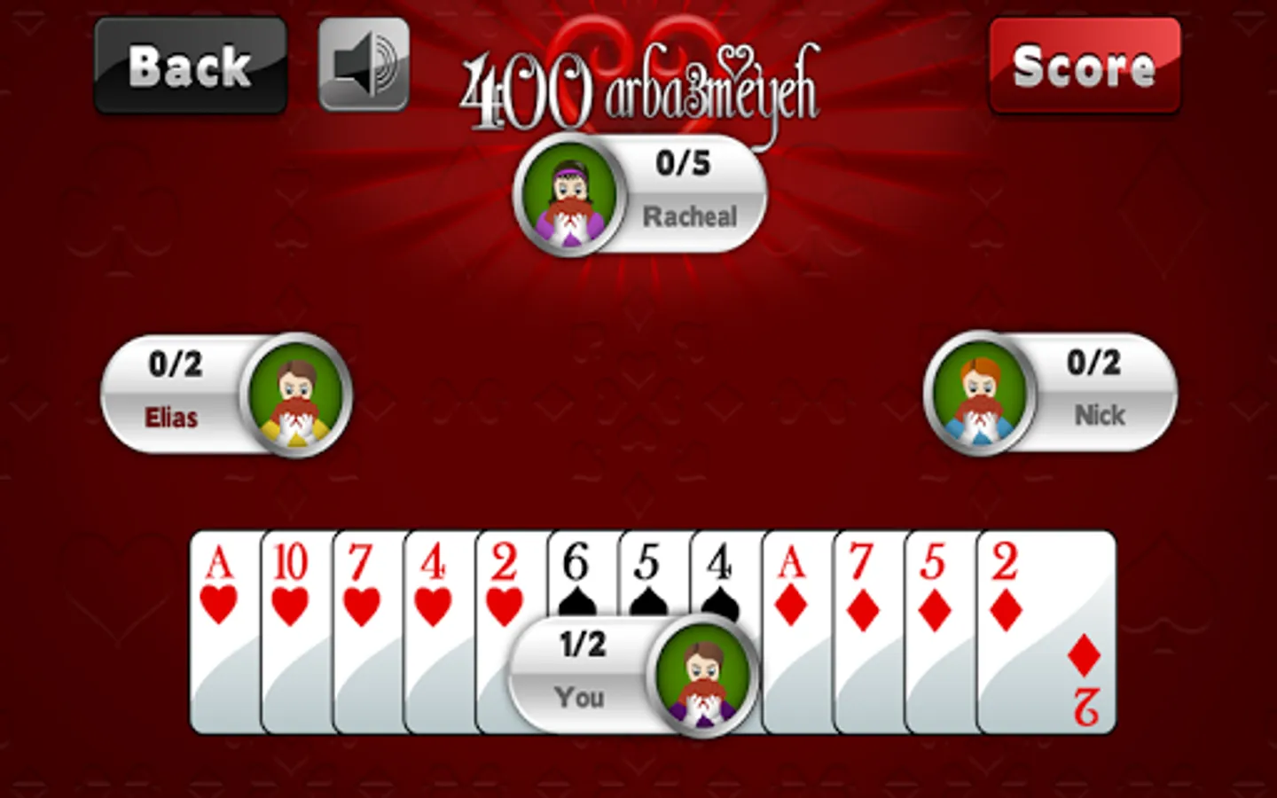 This great app also includes a inbuilt Scoreboard that you can use when playing Arba3meyeh with cards at home with your family and friends, instead of using paper and pen! This scoreboard automatically calculates all scores; sets minimum bets, allows renaming of players!