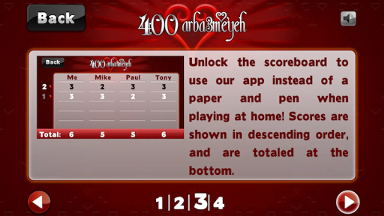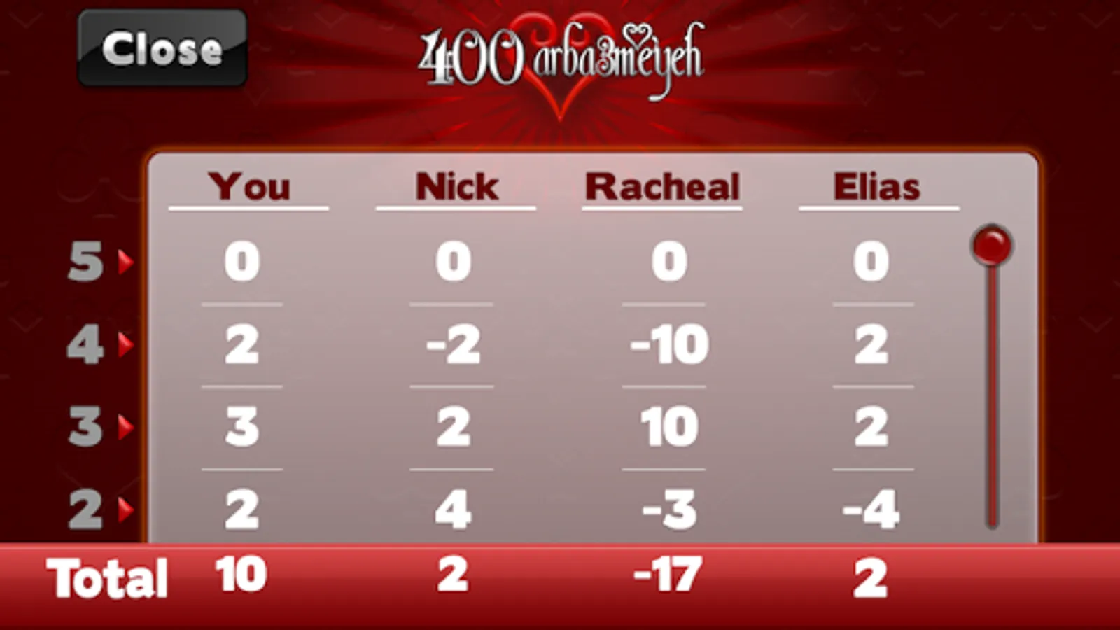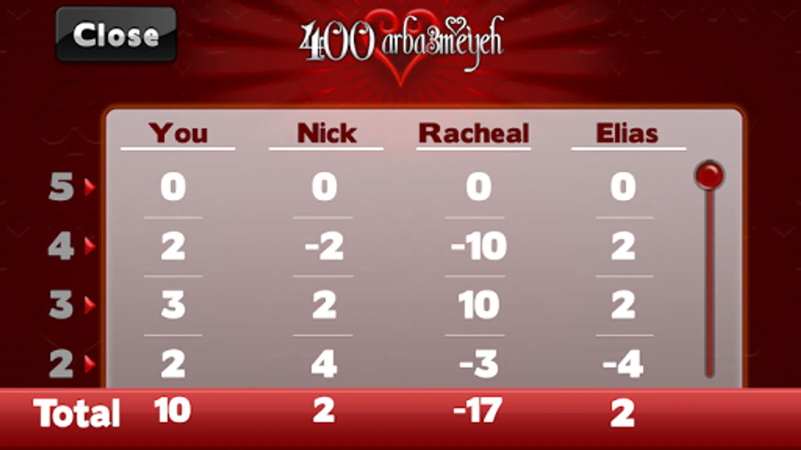 This great app also includes a inbuilt Scoreboard that you can use when playing Arba3meyeh with cards at home with your family and friends, instead of using paper and pen! This scoreboard automatically calculates all scores; sets minimum bets, allows renaming of players!