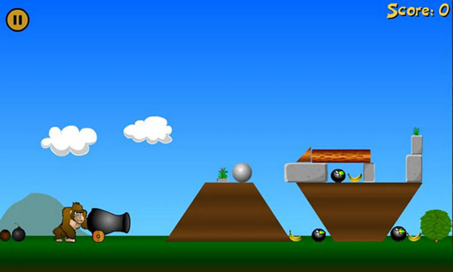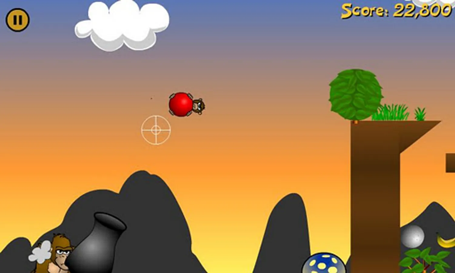 The apes have found a cannon, and you can help them fire it by touching the screen. They'll fill the cannon with coconuts, apes, bouncy balls, bombs, "barrel of monkeys", and anything else they can find, just to get the birds to leave their bananas alone!