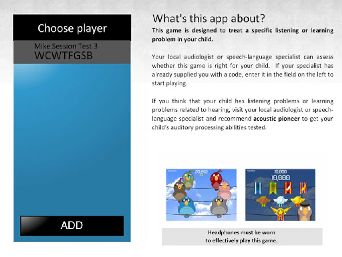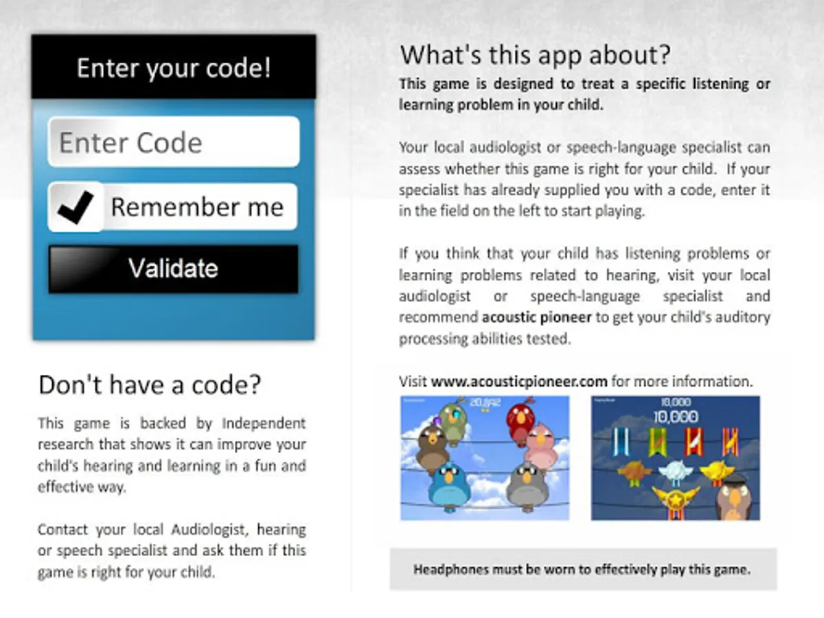 Your local audiologist or speech-language specialist can assess whether this game is right for your child or for an adult with a brain injury. If you think that your child has listening, language or learning problems that might be related to auditory processing, visit your local audiologist or speech-language pathologist and recommend acoustic pioneer to get your child's auditory processing abilities tested.