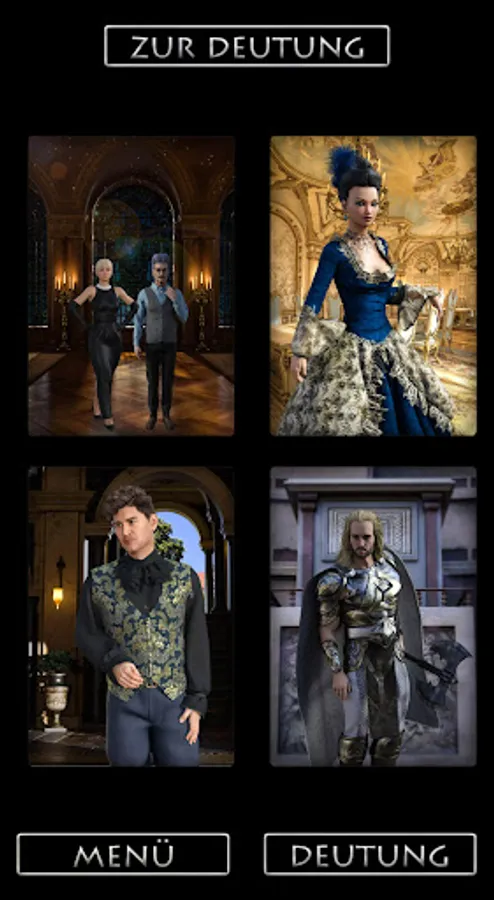 Choice between a reading for singles or for couples. Both partners consider six cards. They show what unites them and what sets them apart. They give tips on how to get to know someone as a single person or how to solve a relationship problem.