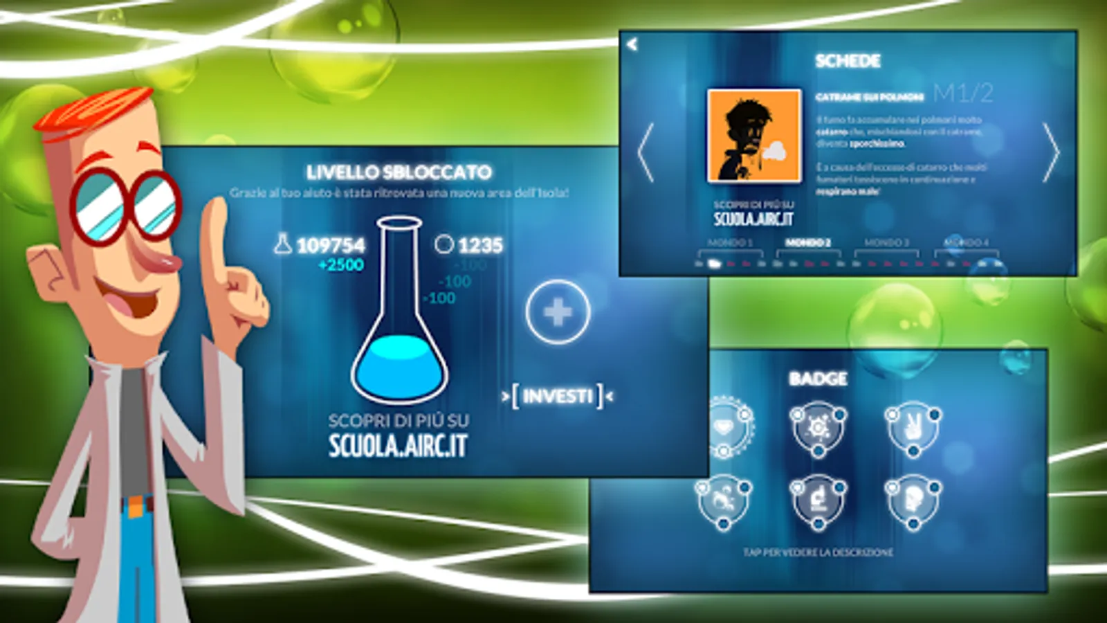The Island of Smoky is an educational video game to say no to the cigarette and find tips for prevention and updates on cancer research related to smoking. This through the information that flows during the game and thanks to the didactic cards of the researcher, rich in texts and images, to collect, use at school, read in the family!
