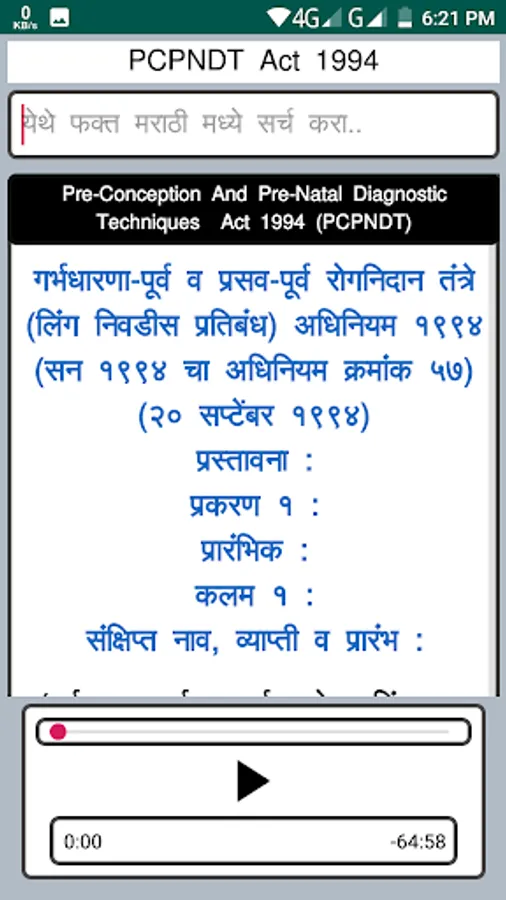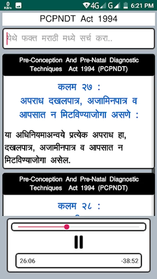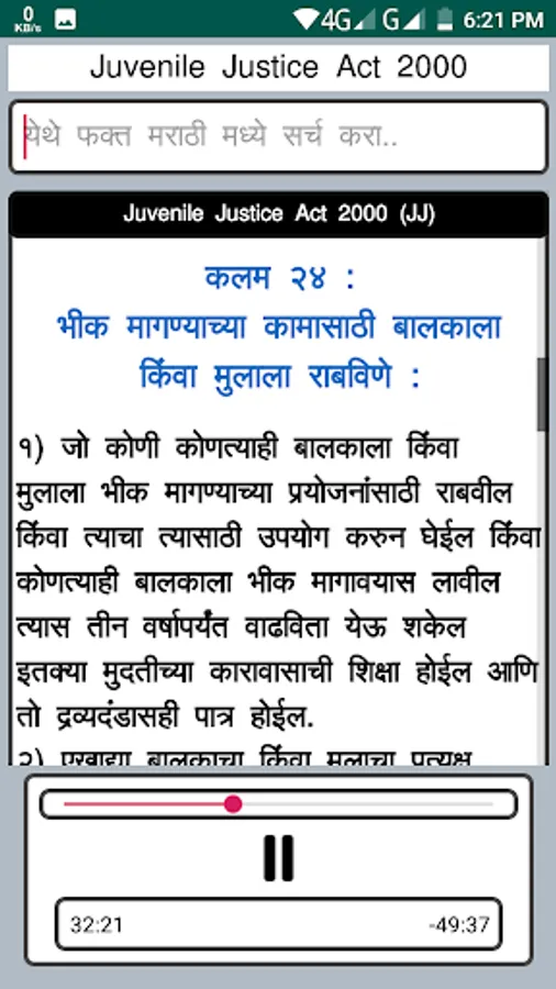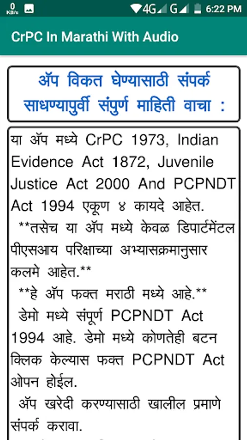 या अॅप मध्ये डिपार्टमेंटल स्पर्धा परिक्षेच्या अभ्यासक्रमातील फौजदारी प्रक्रिया संहिता,१९७३ आणि भारतीय पुरावा अधिनियम १८७२ कायद्याची सर्व कलमे लिखित व ऑडियो स्वरुपात आहेत. एकूण ऑडियो ३.३० तासाचा आहे.