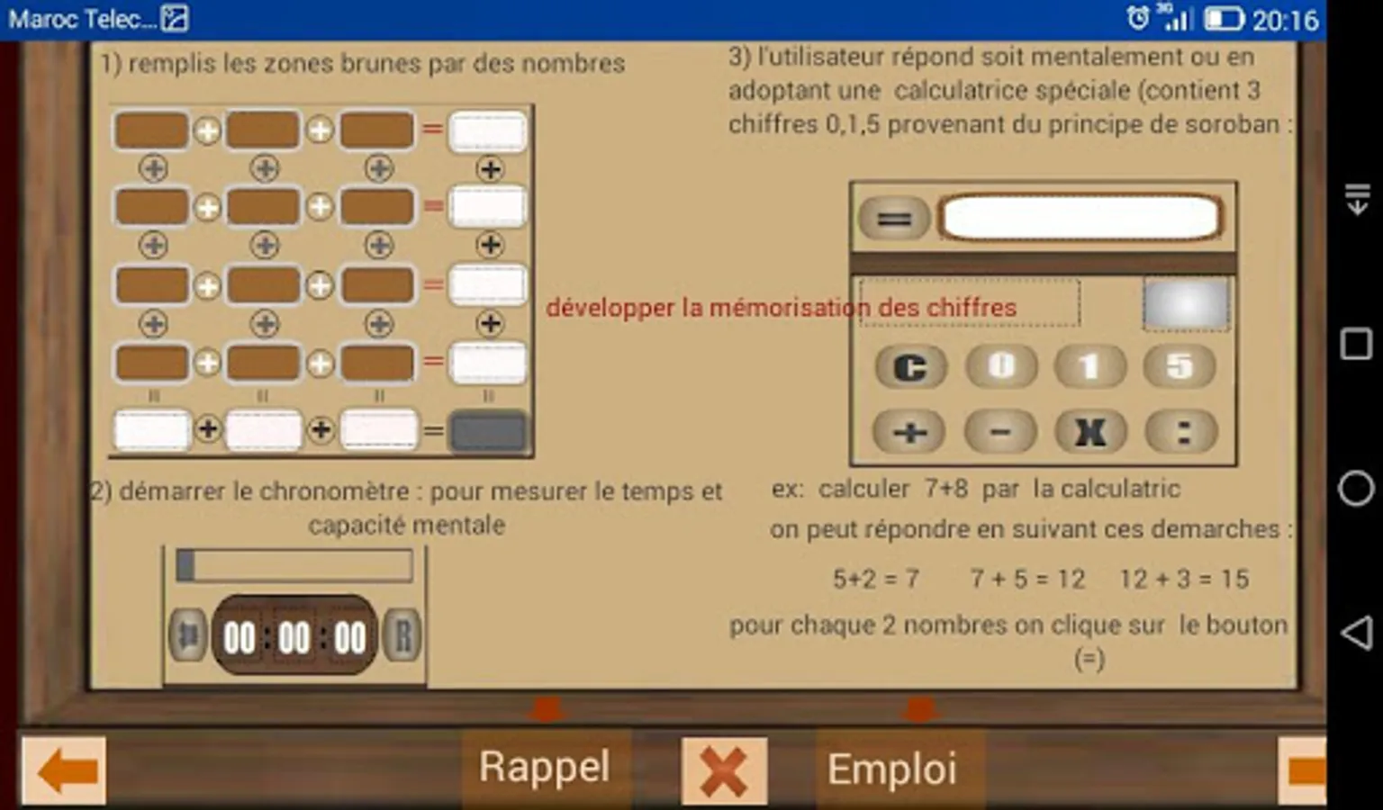 - the other to develop the memory of children and adults by doing exercises and using a special calculator (contains 3 digit: 0.1.5). and a stopwatch to control and measure mental capacity.