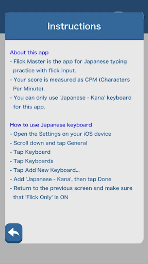 Flick Master is the app for Japanese typing practice with flick input. It's simple but useful for improving your Japanese Kana typing skills.