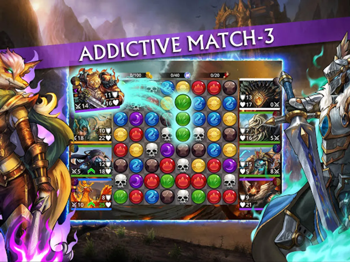 Immerse yourself in a world of adventure as you collect heroes from across the realm and battle foes with the power of the puzzle board. Unlock new realms with kingdoms to conquer and hundreds of troops to collect.Join the war and start your journey to becoming a puzzle legend today!