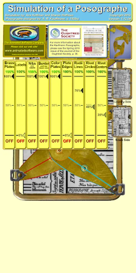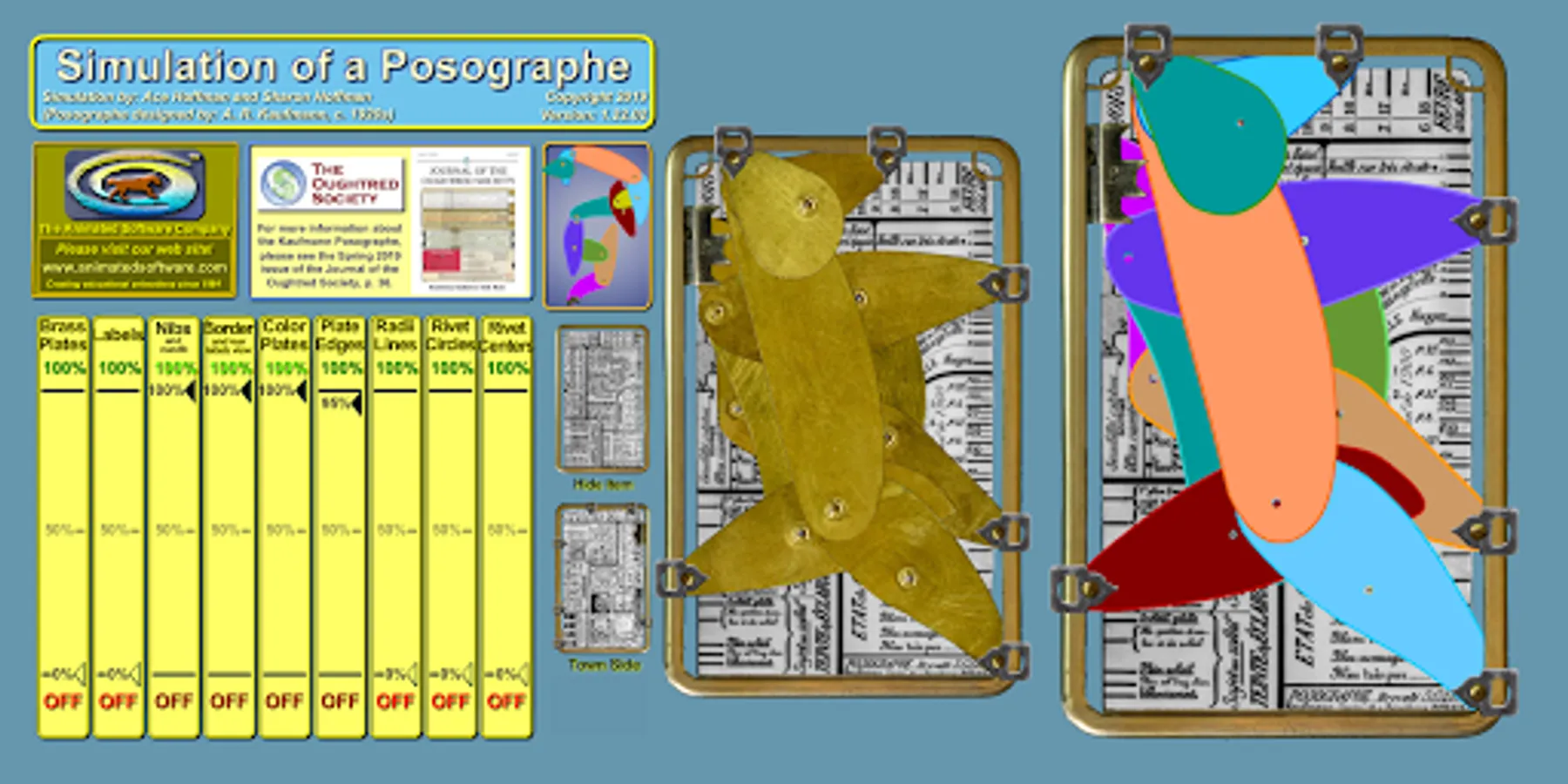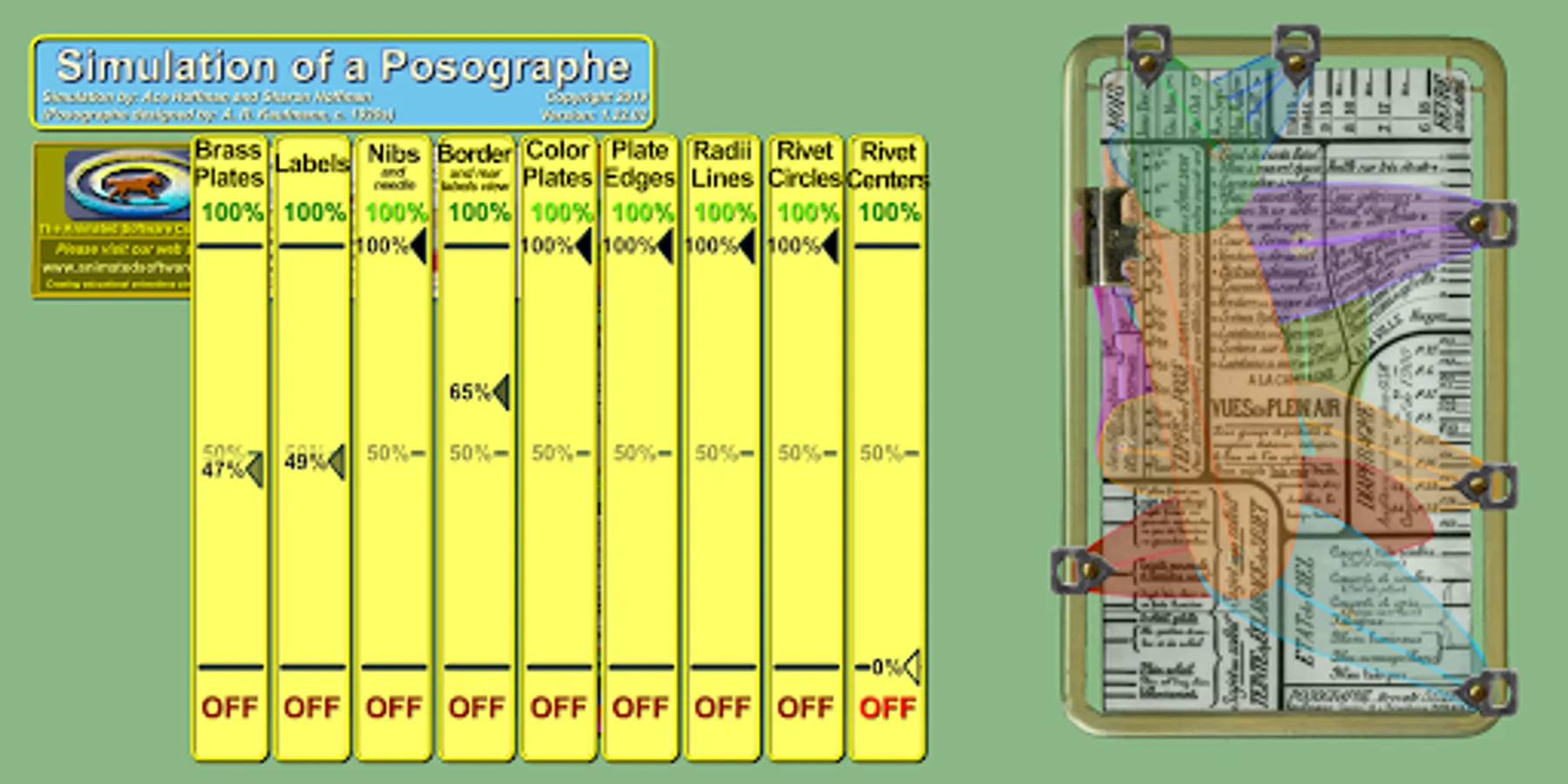 This animation was originally created based on an article in the Oughtred Society's bi-annual journal, Spring 2019 issue, and then the lead programmer purchased an antique Posographe in order to make more accurate measurements and higher resolution photographs, to check the placement of some hidden connections, and lastly, to test the accuracy of the model against an actual Posographe. It’s very close!