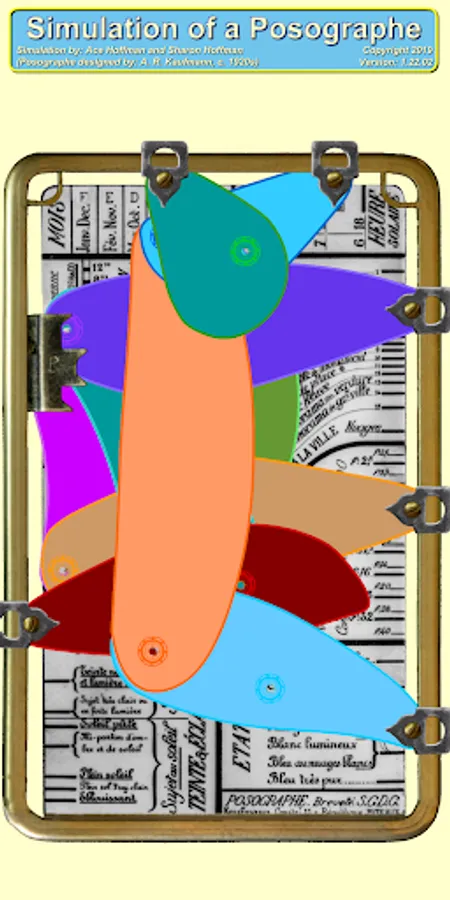 Kaufmann invented and patented several versions of the Posographe and a couple of other related mechanical contraptions. The mathematical theory behind how the Posographe works was conceived around the same time, and Kaufmann apparently had a number of correspondences with the mathematician who invented the theory. Although the theory is not explained here, the math behind the Posographe is illustrated with connecting lines, colored brass plates (or not, if you prefer!), circles indicating intersecting positions of the pieces, and various additional ways of exploring "under the hood."