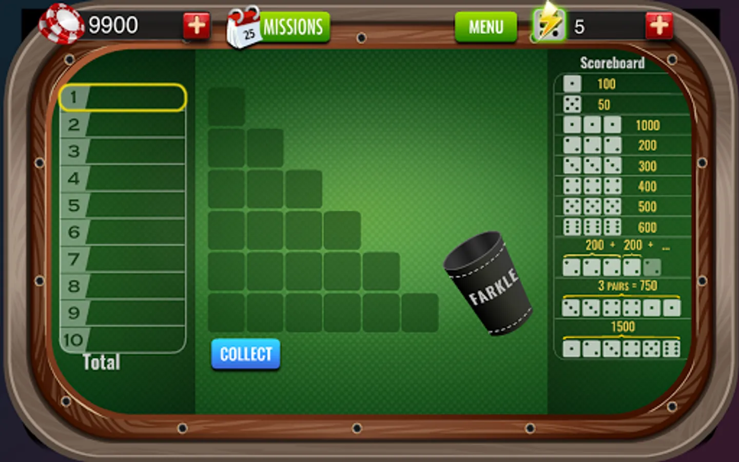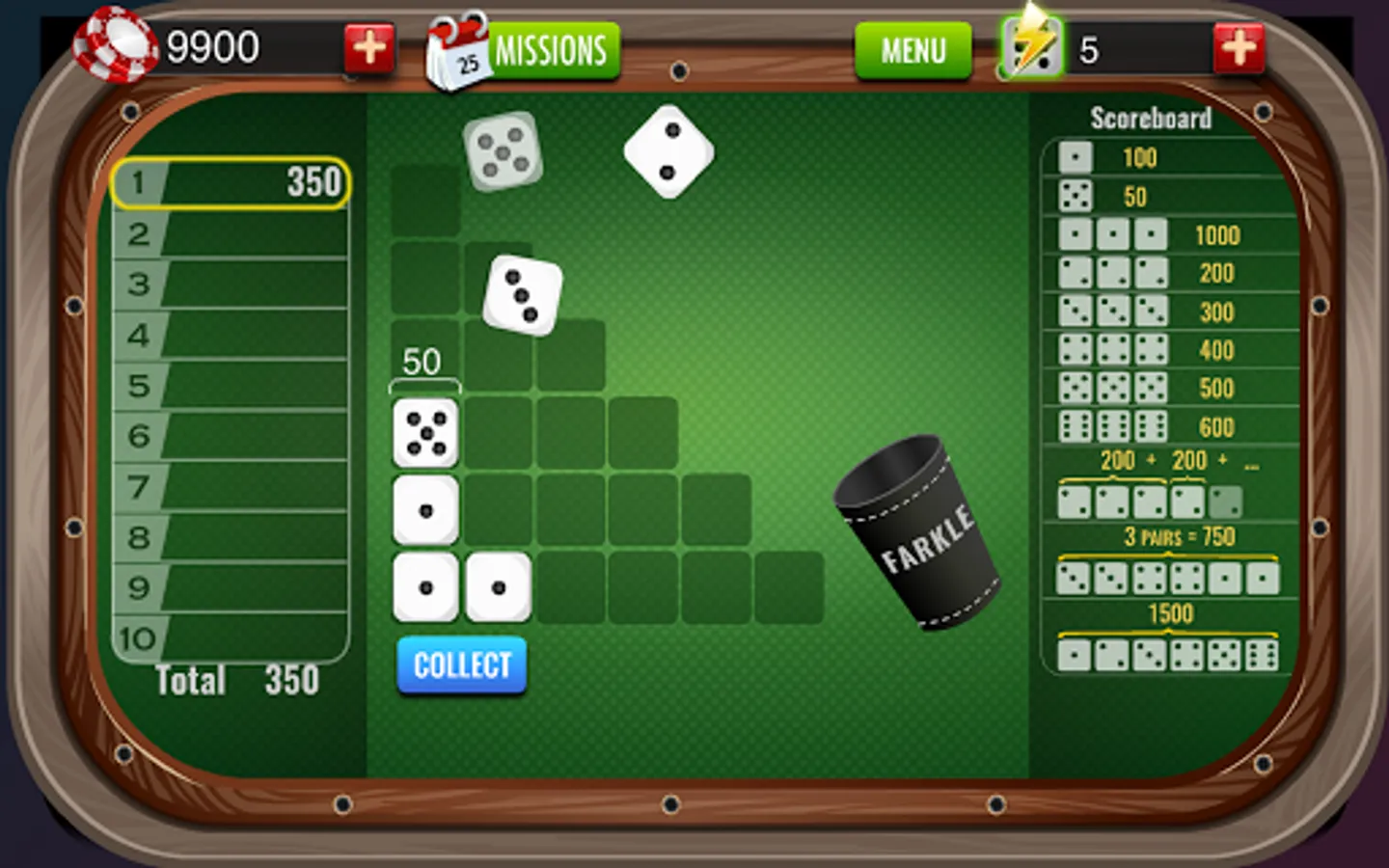 Enjoy the enticing dice game with this fast paced Farkle – Dice Game for ABSOLUTELY FREE AND PLAY OFFLINE ANY WHERE ANY TIME!!!