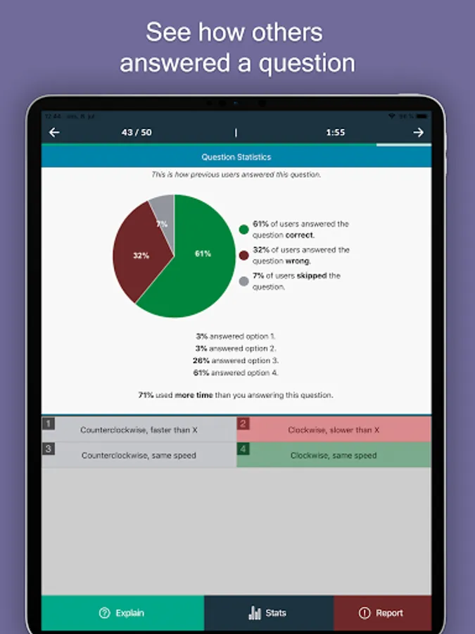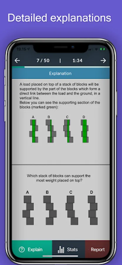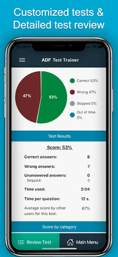 After each practice session your results with score are displayed, you can review questions and read a detailed explanation of almost every answer.