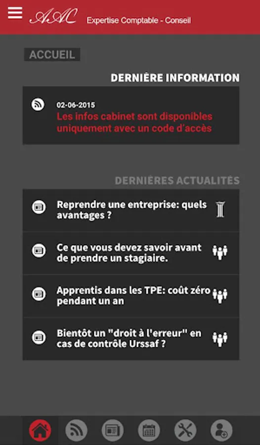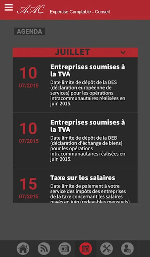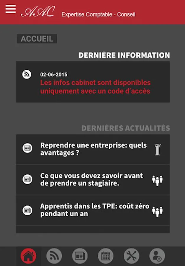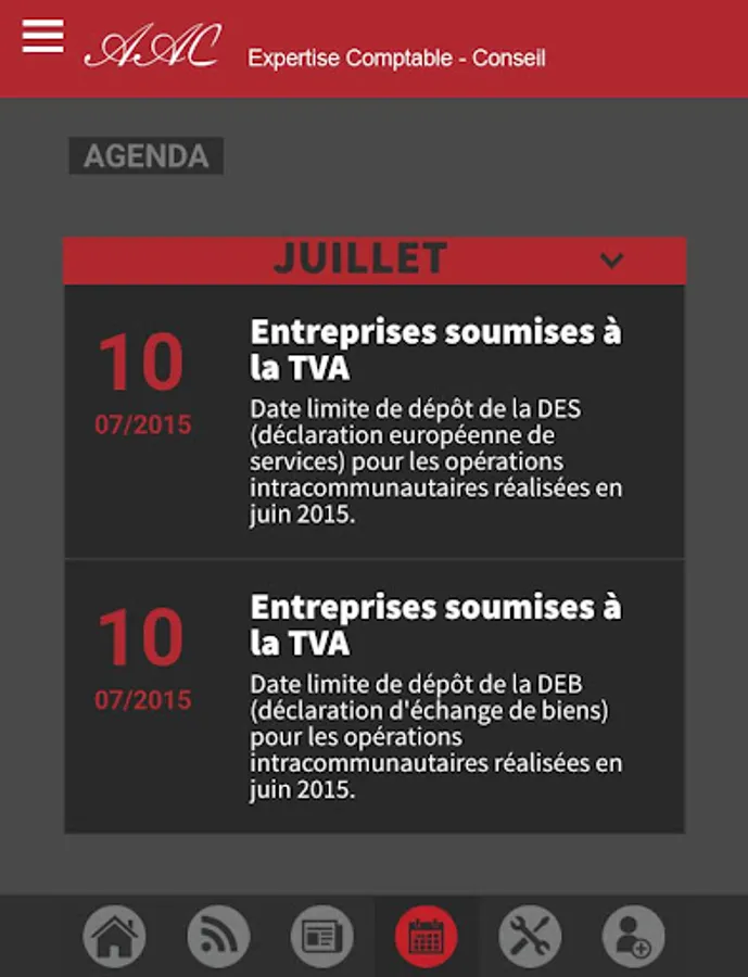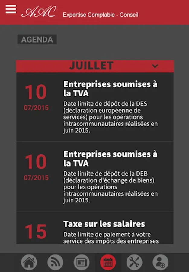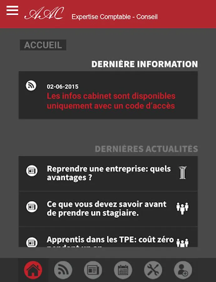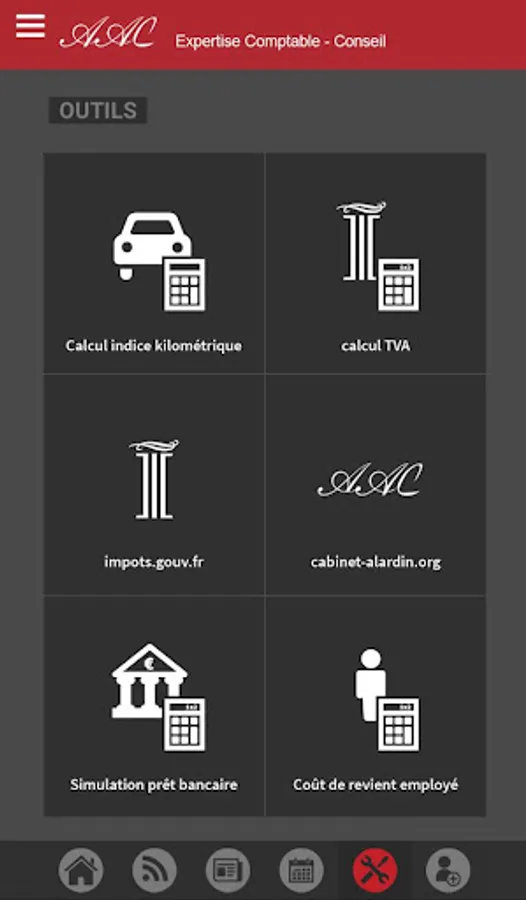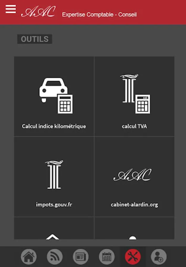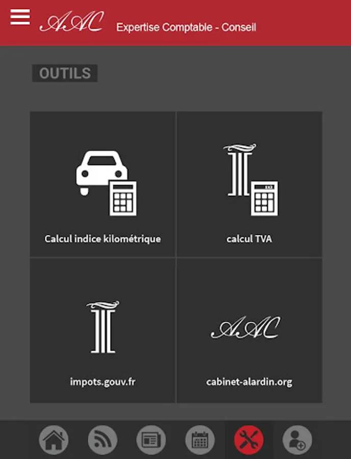 Get the latest updates from your AAC accounting firm, as well as the latest tax, legal and social, application AAC also allows you to quickly perform calculations via the Toolbox (calculation of the cost of an employee, odometer index, calculation of VAT, or bank loan simulation).