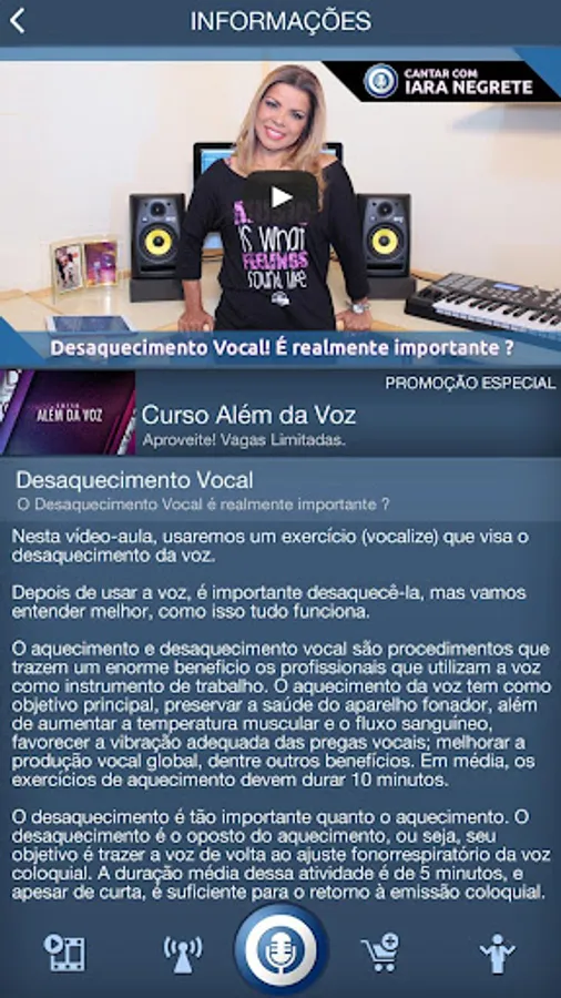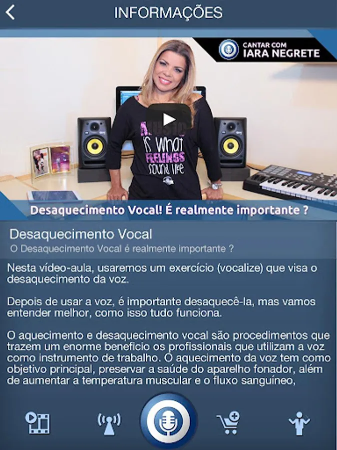 In this application you will have access to video lessons and video transmissions, with tips and exercises to improve their performance as a singer, speaker, speaker or anyone who uses his voice as a working tool.