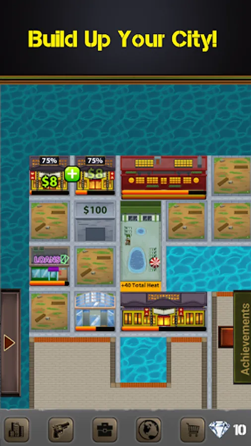 Create your City by building black market buildings. But choose wisely! Some Buildings are better than others and they must be placed with strategy for maximum effect!