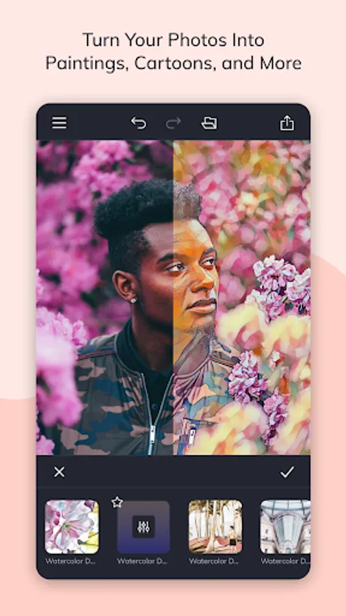 Our Artsy effects are the most unique feature of our Photo Editor. With one tap, your photos will take on stunning, artistic characteristics. From realistic textures to natural-looking brush strokes and saturated color palettes, our artsy effects will instantly turn your photo into a work of art!