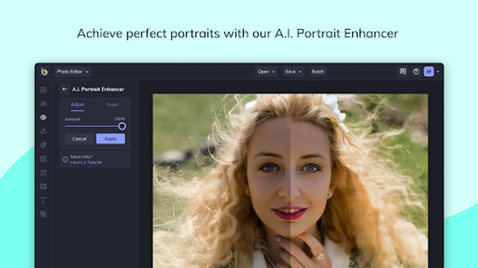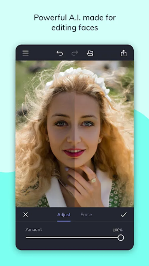Our A.I. Portrait Enhancer gives you professional portrait retouching results, all in a single tap. Quickly enhance exposure, soften the appearance of fine lines and blemishes on all skin tones, whiten teeth and brighten eyes without eliminating freckles and beauty marks!