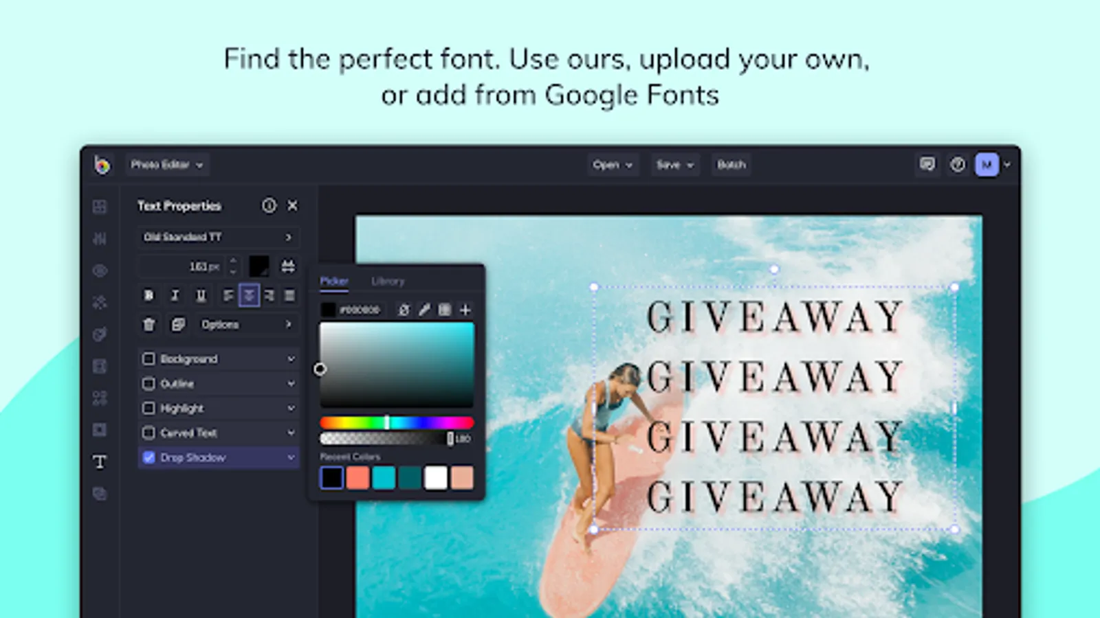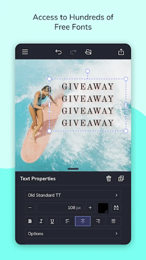 Our Text Editor is packed full of fonts and customization options to add text to photos, designs, and collages. Choose from our collection of fonts hand-selected by our team of graphic designers, upload your own fonts, or use Google Fonts!