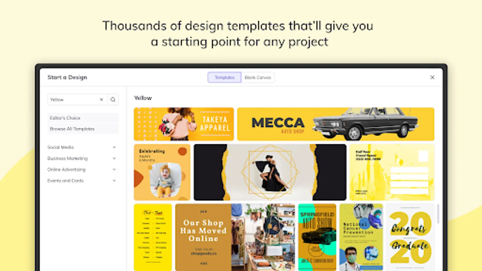 Our design templates offer the perfect starting point for any project. You’ll find thousands of design templates created by our team of professional graphic designers. We provide templates for birthdays, weddings, small businesses, and more! Don't want to start with a template? No problem! Start your design with a blank canvas and let your creativity take over!