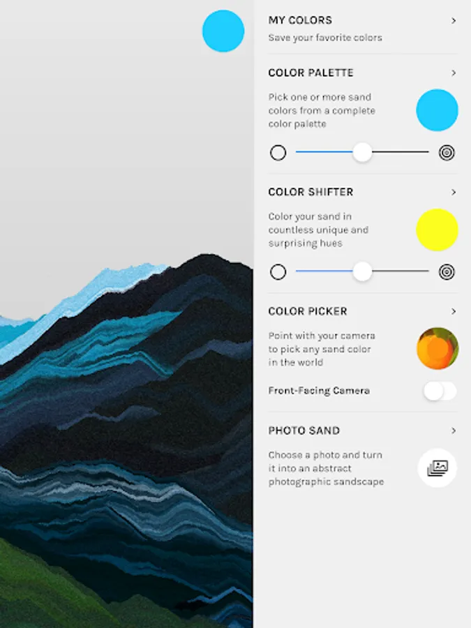 COLOR PICKER: With Color Picker, you may pick the sand color from around you using your device camera. It takes a little practice to point your camera and draw at the same time, but in return you get truly unique colors. Try adjusting the color change intensity low in the beginning to keep things under control!