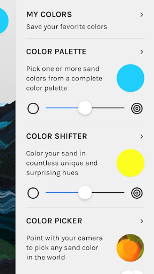 MY COLORS: Save your favorite colors in My Colors and access them quickly by long pressing the color button on the sand canvas. Try saving colors from around with Color Picker!
