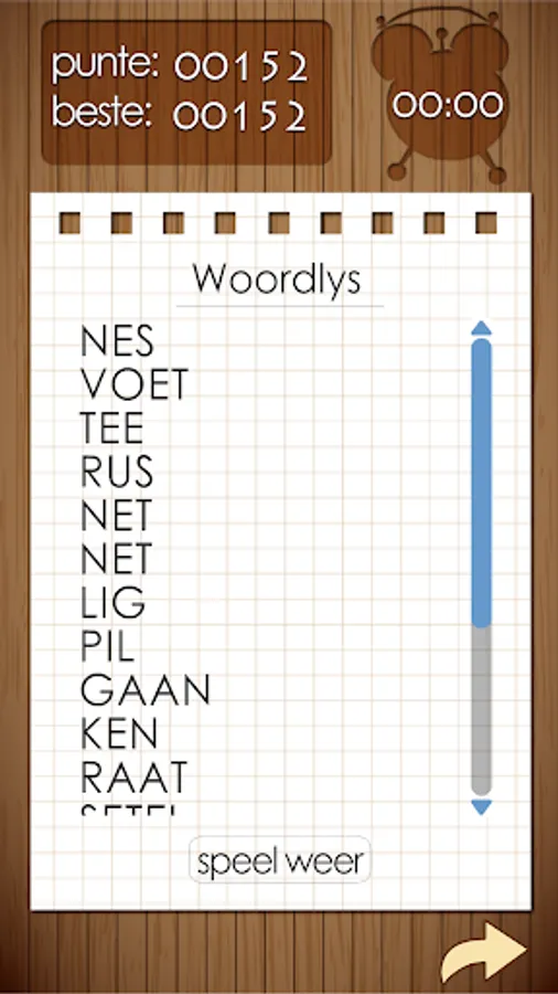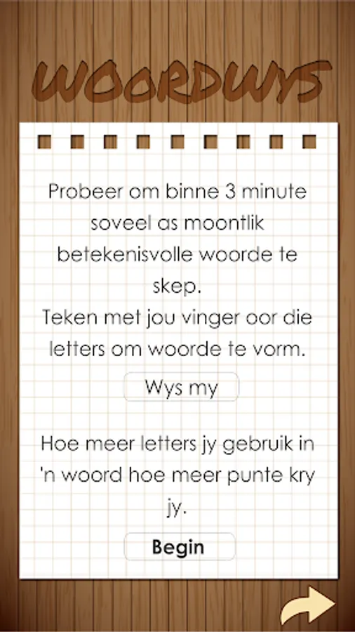 In hierdie speletjie moet jy probeer om binne 3 minute soveel betekenisvolle woorde te skep as wat jy kan. Die woorde word geskep deur met jou vinger oor 'n matriks van letters te teken.