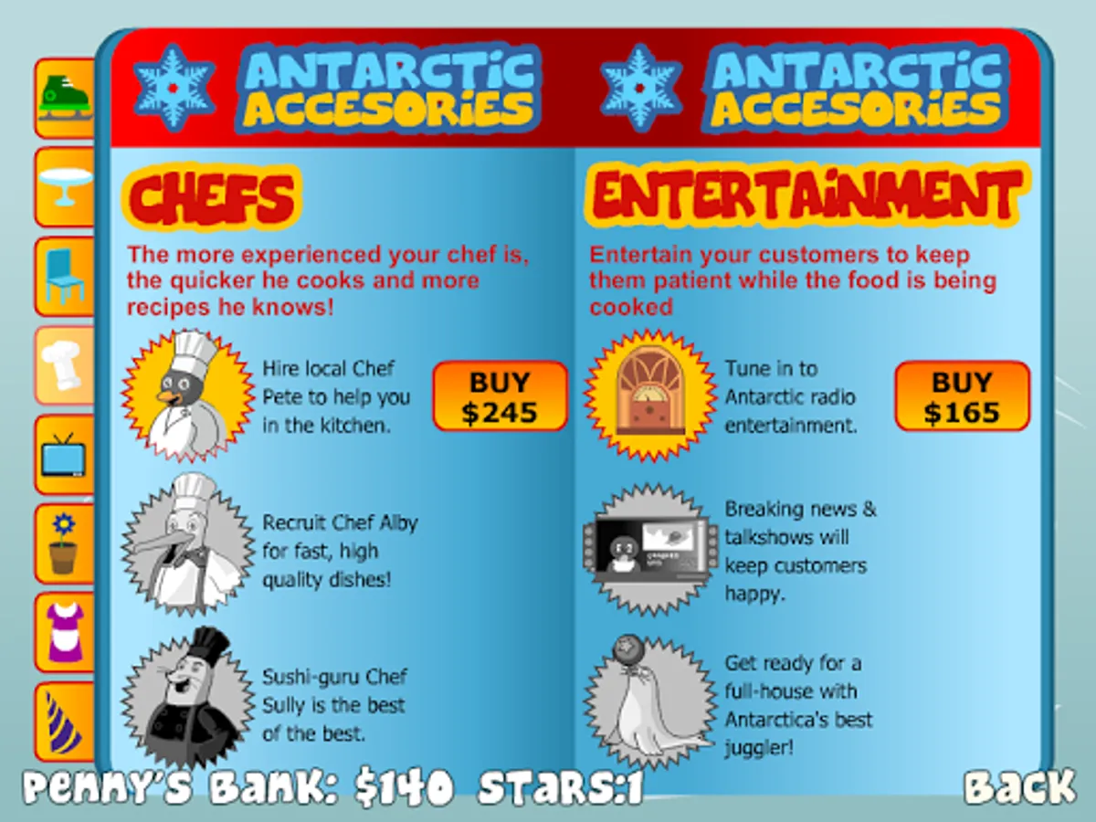 At the start, you are managing a restaurant in one area of the Antarctic, but your goal is to expand the chain to the whole area - Become the diner legend of the Antarctic!