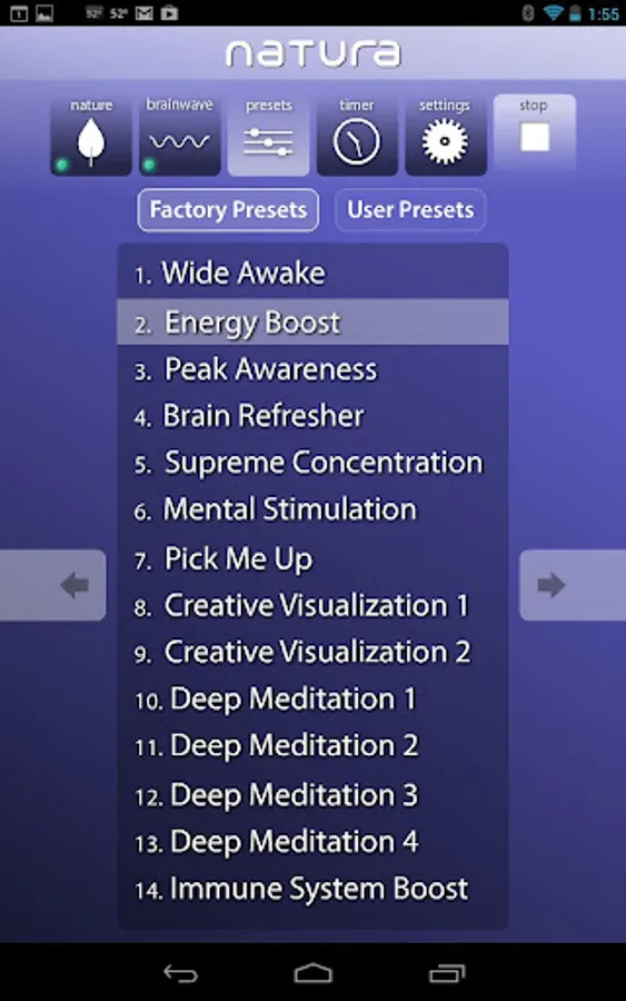 Quickly accelerate your training and focus by using the 38 easy Quick Start Factory Presets that include the popular: Wide Awake, Energy Boost, Peak Awareness, Brain Refresher, Supreme Concentration, Mental Stimulation, Pick Me Up, Creative Visualization 1 & 2, Deep Meditation 1-4, Immune System Boost and more.
