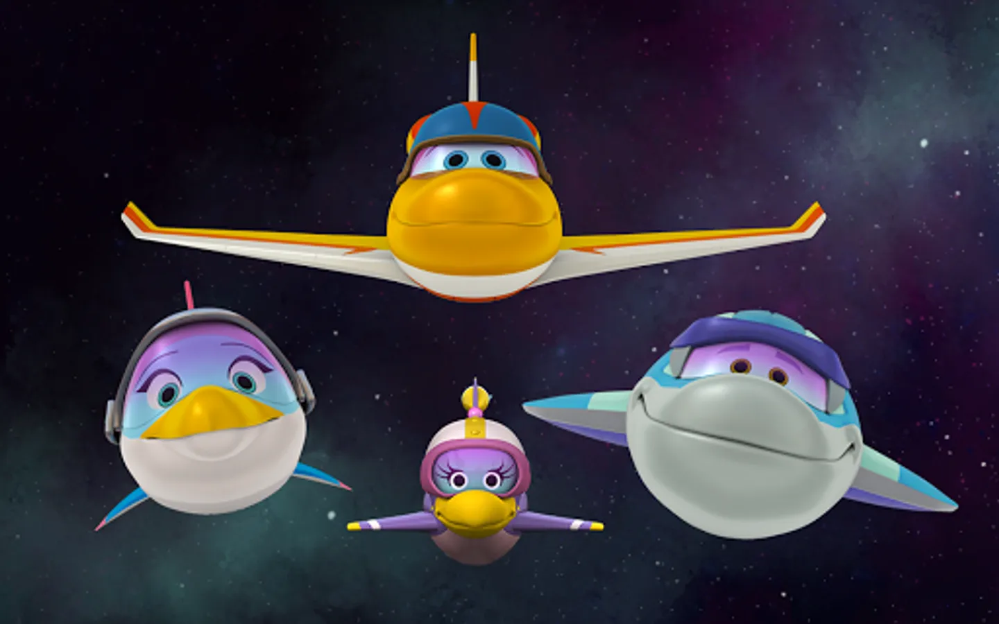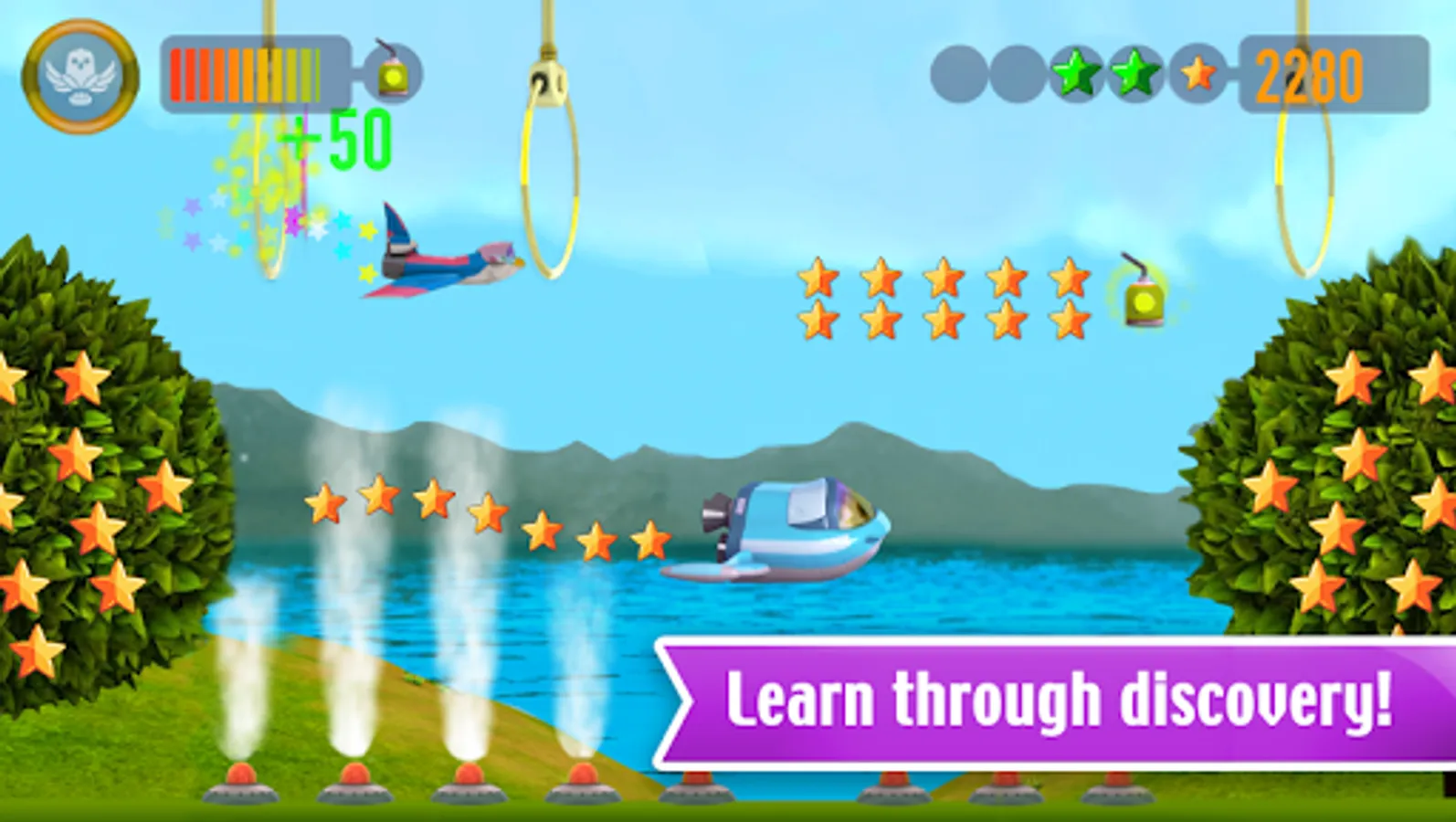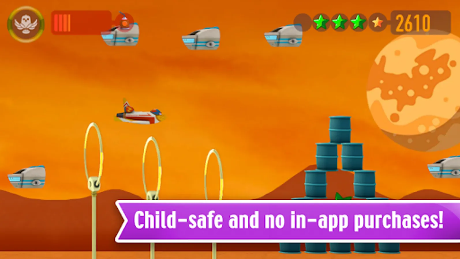 A twist on the traditional flying game, kids can tag-team between four characters — Eagle, Robyn, Hawk, and Starling — as they soar through space and around Stardust Bay, collecting stars and avoiding obstacles... just don't run out of fuel!