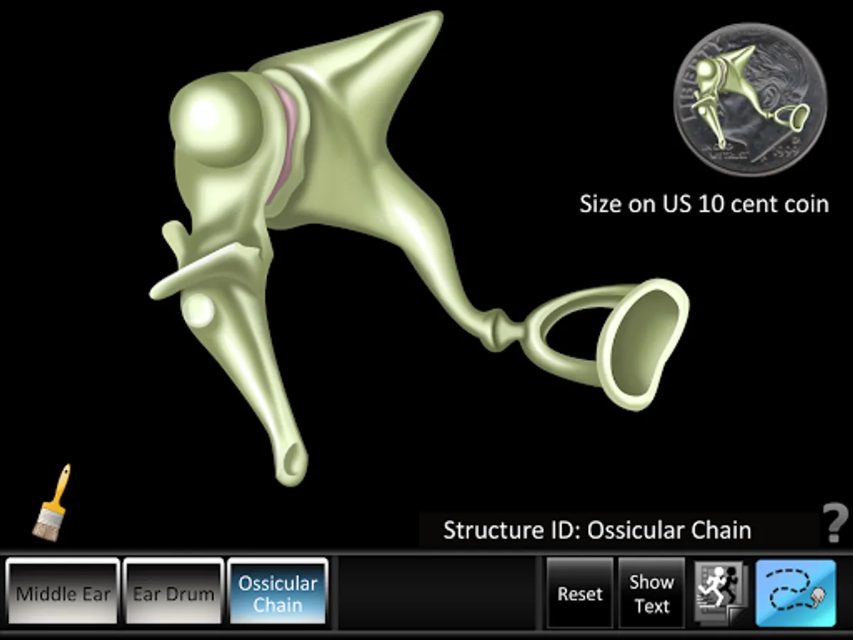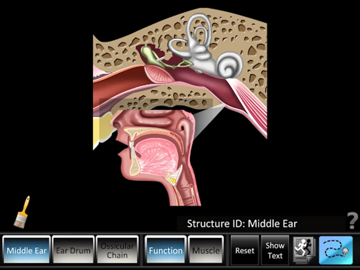 • Structure ID for the middle ear and eustachian muscle, eardrum and ossicular chain. As each part is touched, the part highlights and the part name and description text changes. Description text shows or hides on demand.