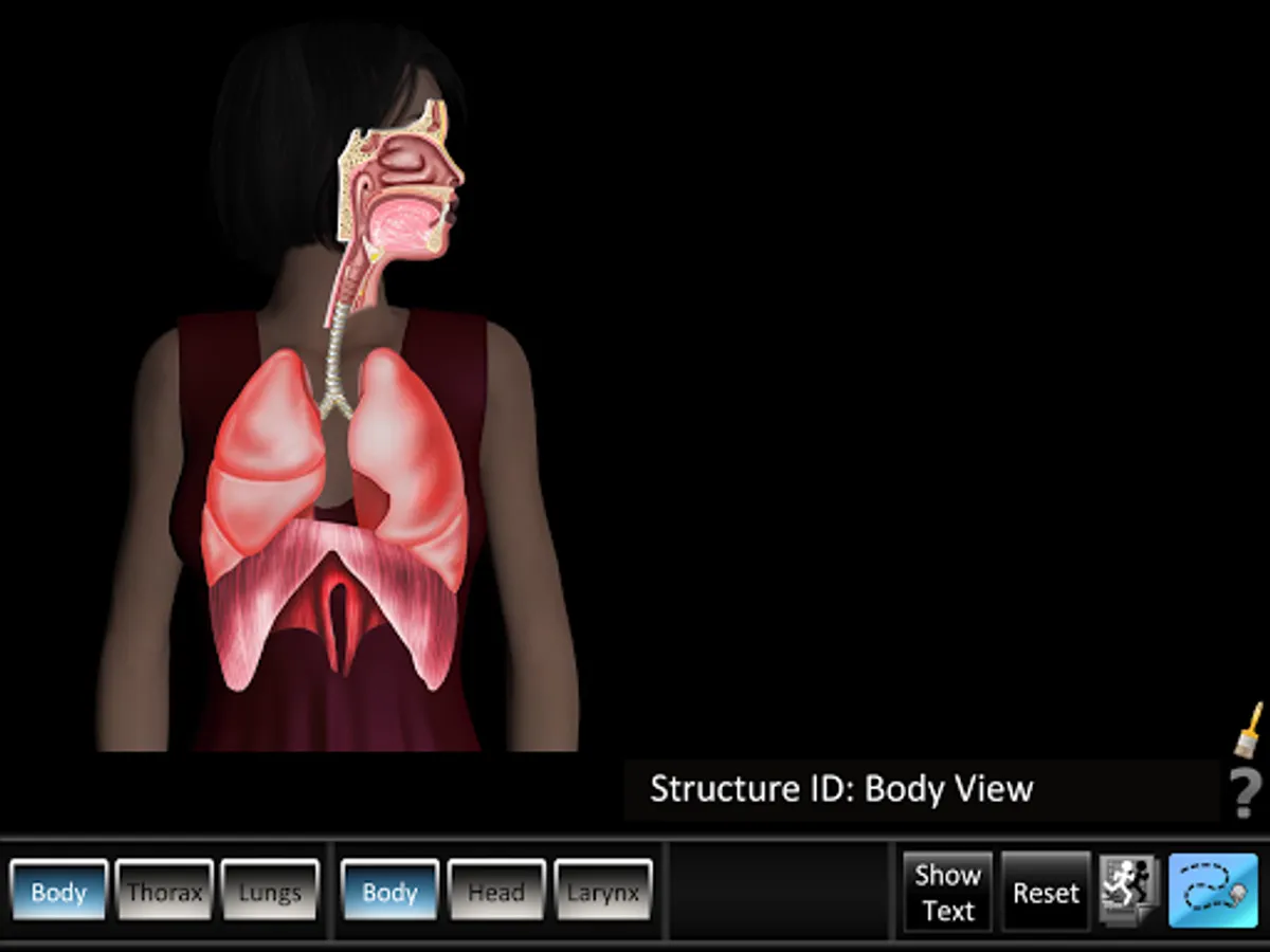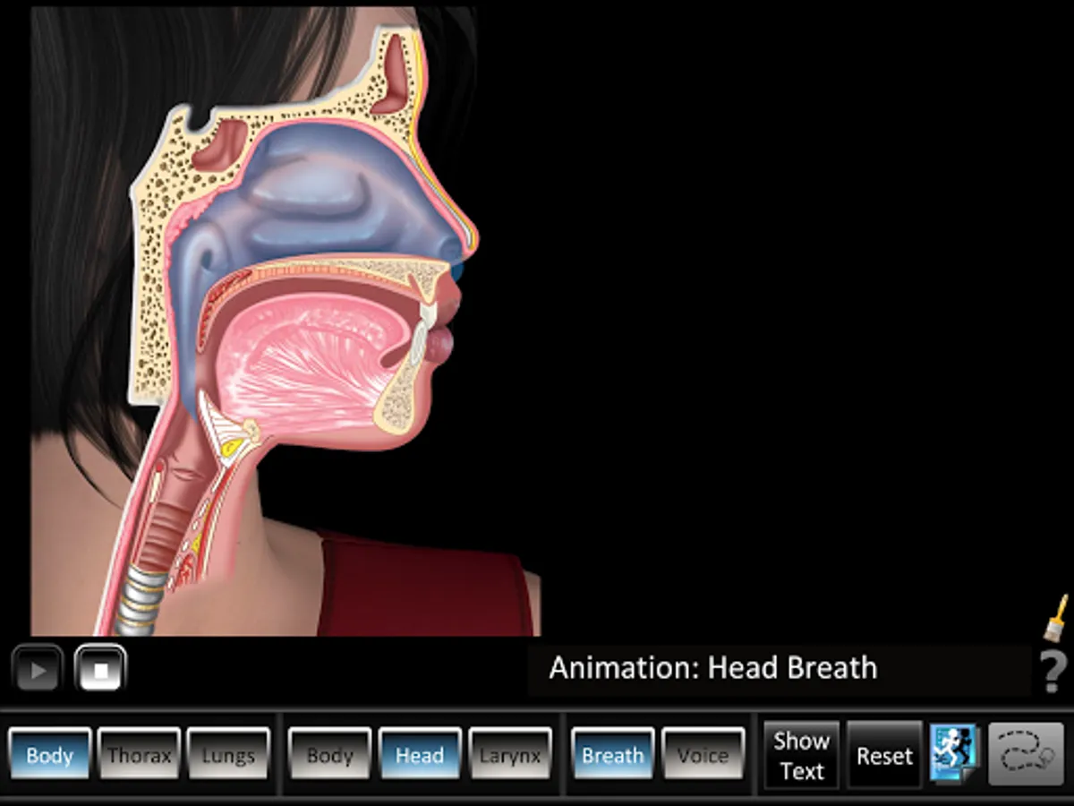 • Body – Touch key parts of respiration for the body, head and larynx to see their names and text highlight. Animation views of inhalation and exhalation airflow for the body, head and larynx. Watch the larynx move with quiet and voiced breathing for easy understanding of this complex process.