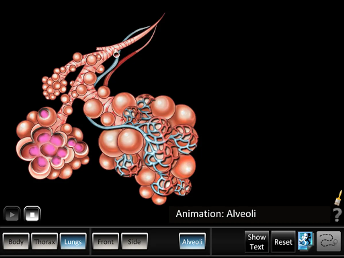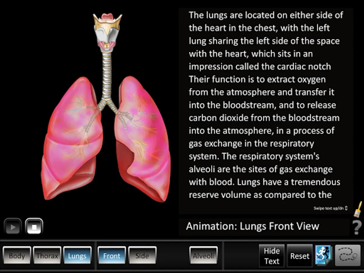 • Lungs – Front and side animation views of the lungs and the alveoli breathing. Front, side, back lungs and alveoli structure ID.