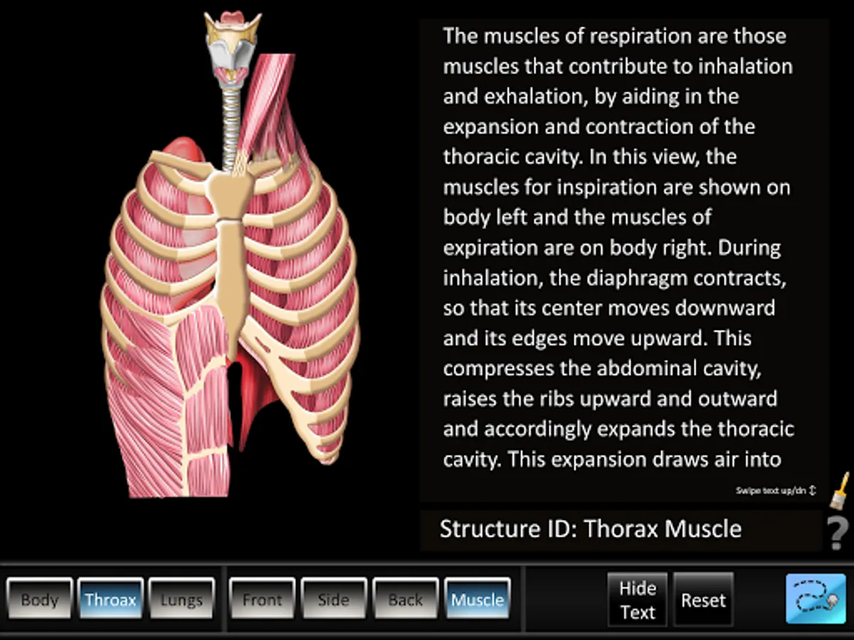 • Thorax – The ribs, diaphragm & lungs are animated to show how these amazing structures work together. Front, side and back views are provided. Button shows and hides front and side rib animation. Structure ID for the muscles of respiration and key front, side, back structures are included.