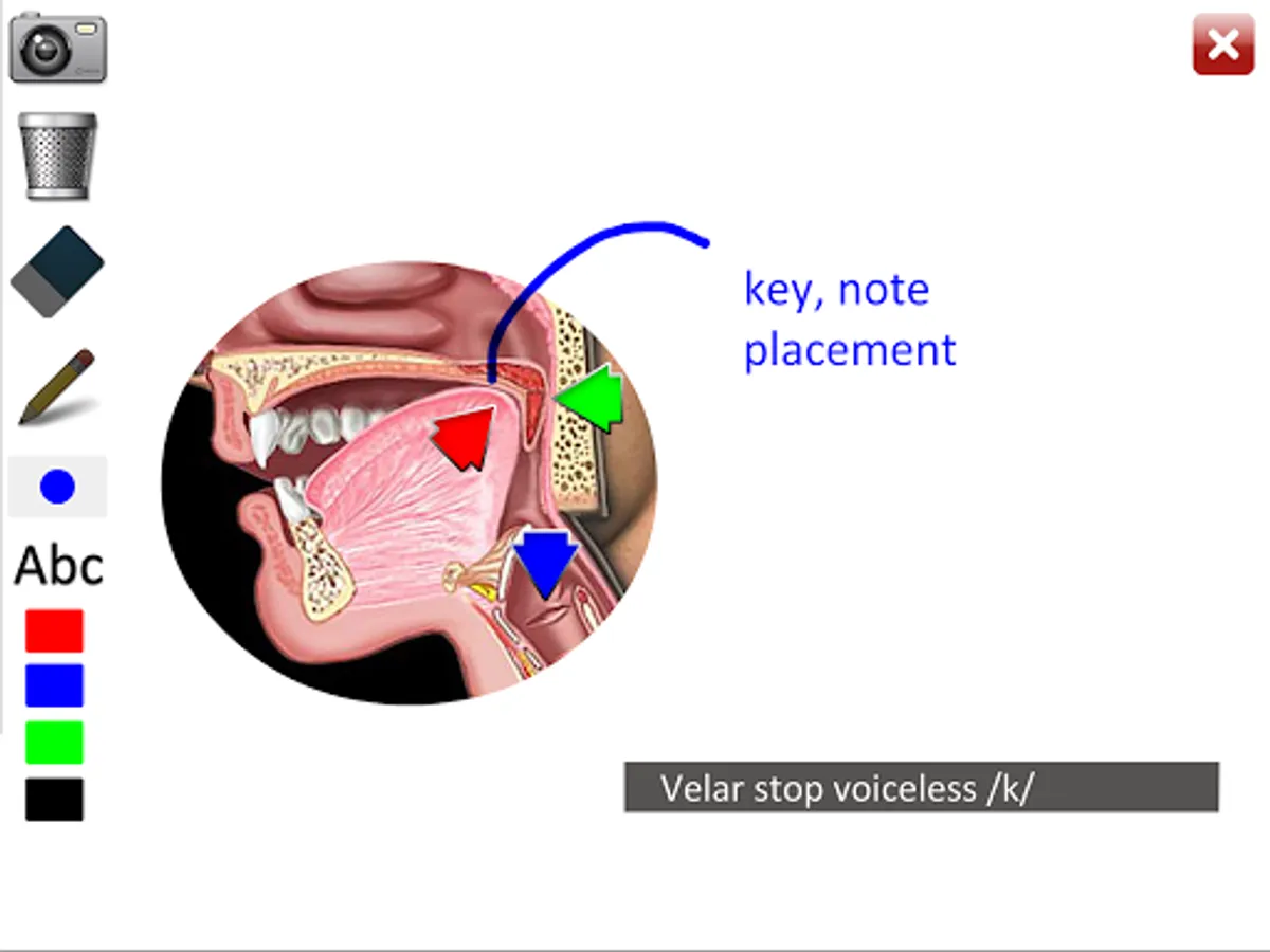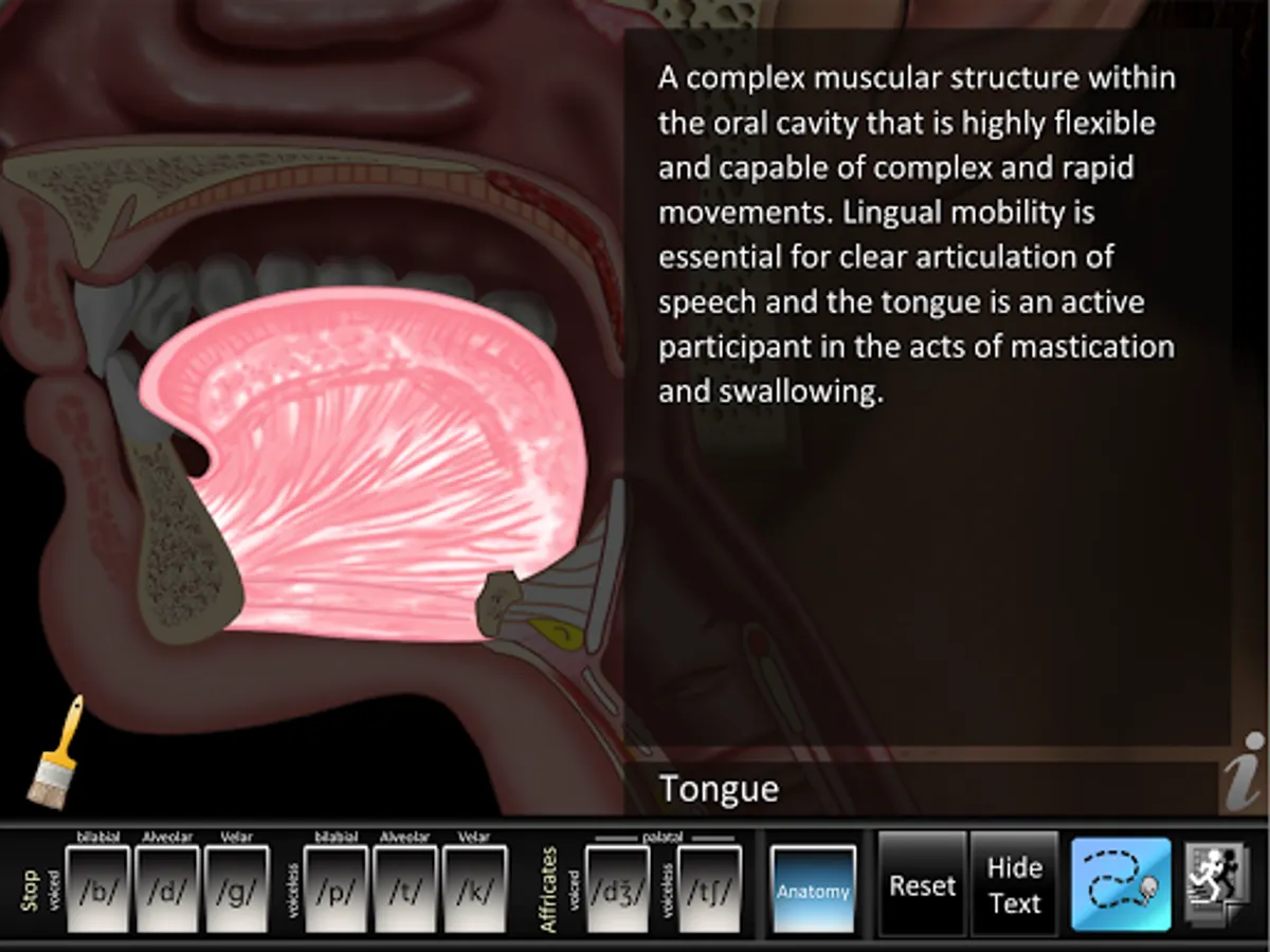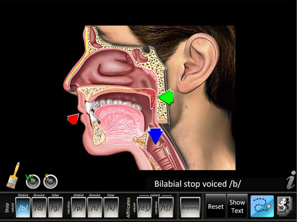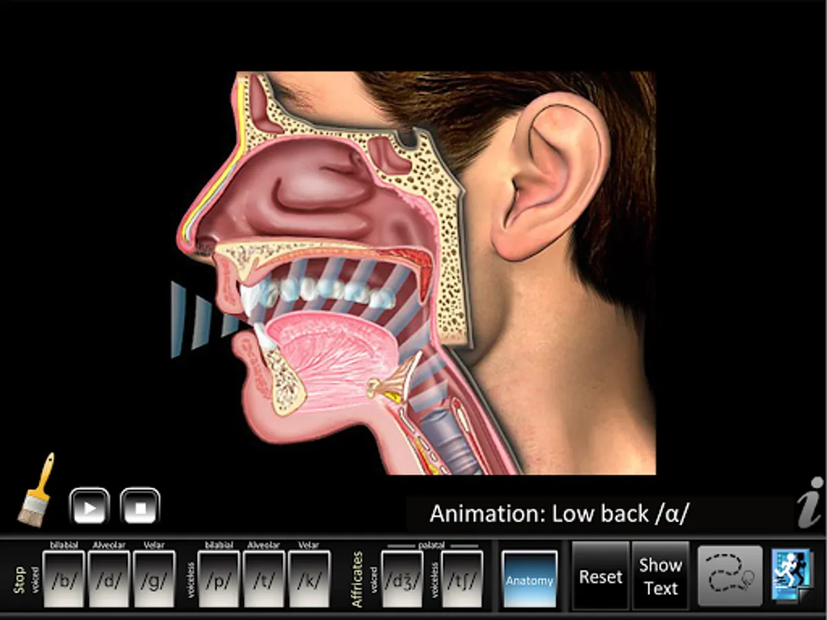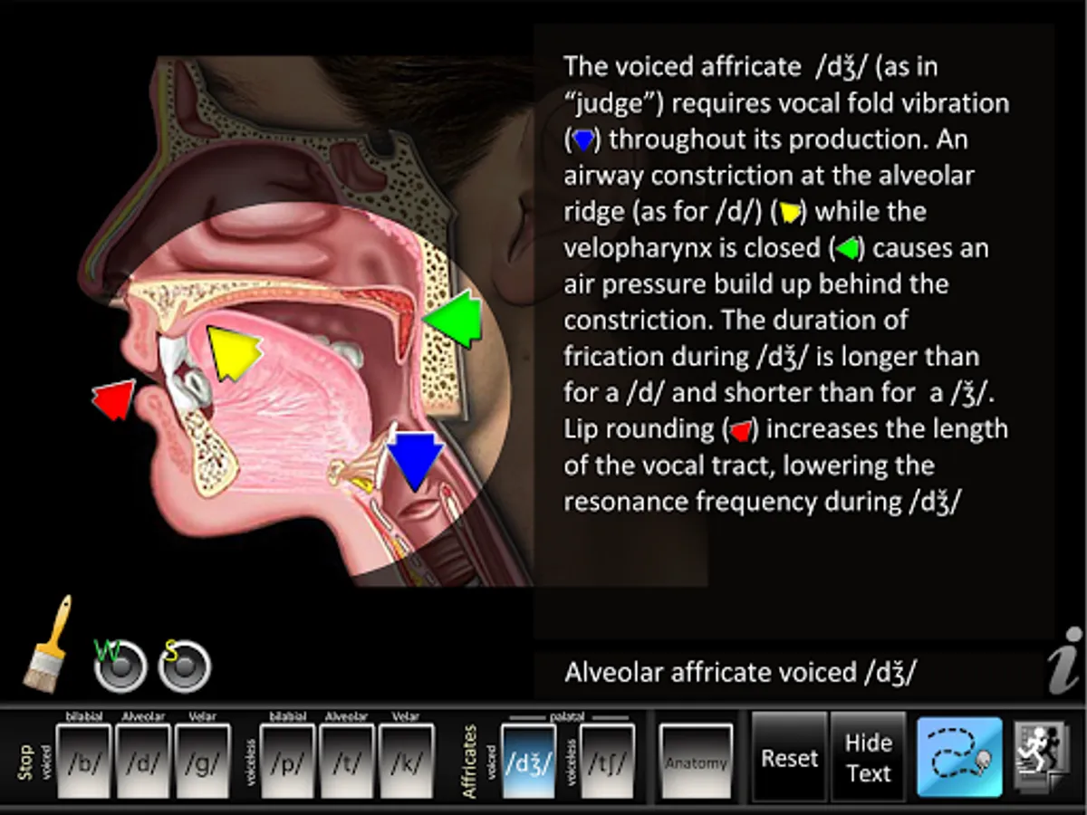 • Animations: each consonant shows a lateral view of dynamic movements of the jaw, lips, tongue, velum (soft palate), and larynx needed for proper articulation of that consonant. Audio for each consonant sound is synchronized with the dynamic animations. Anatomy animation included.