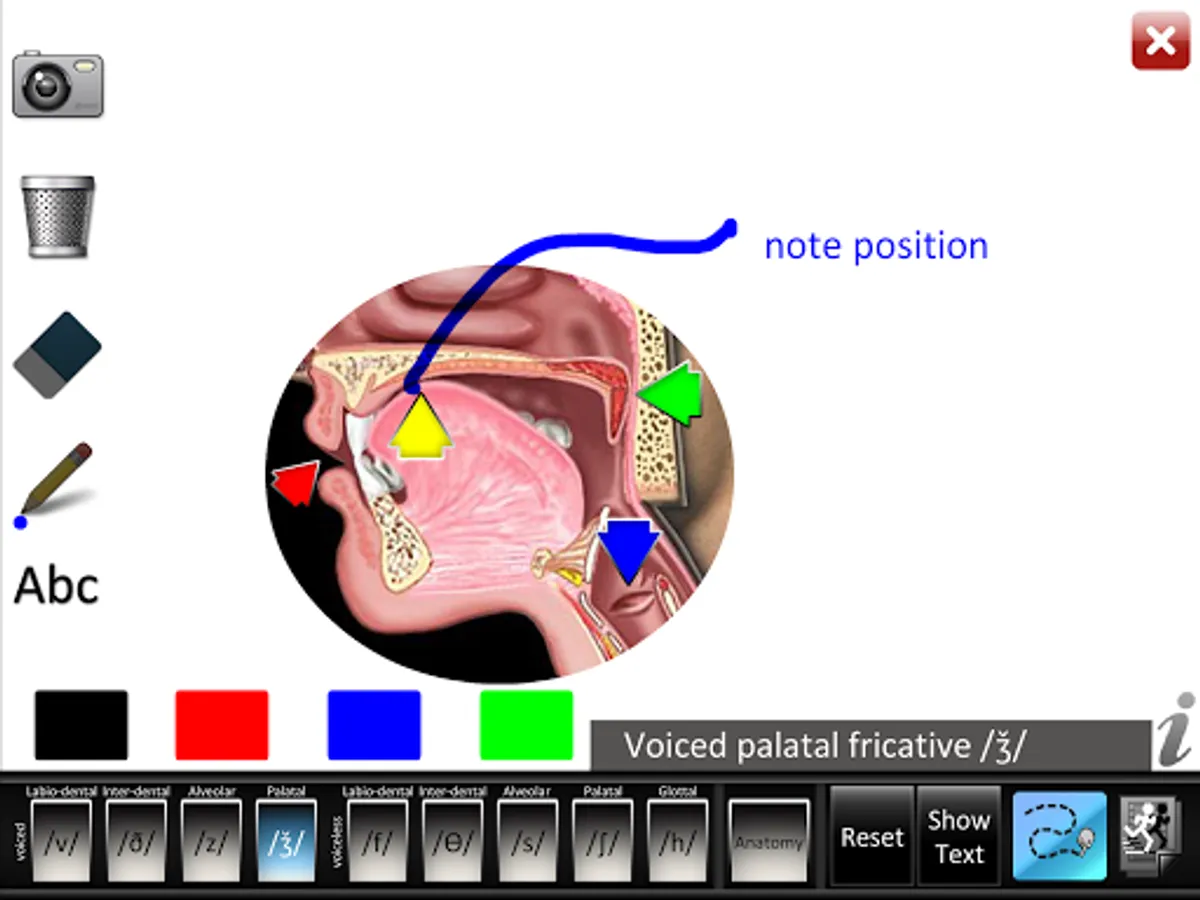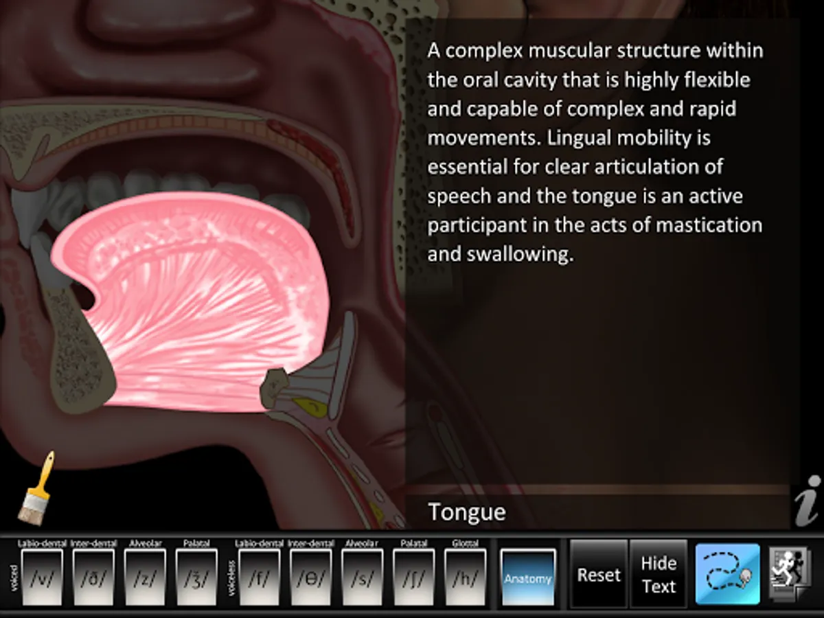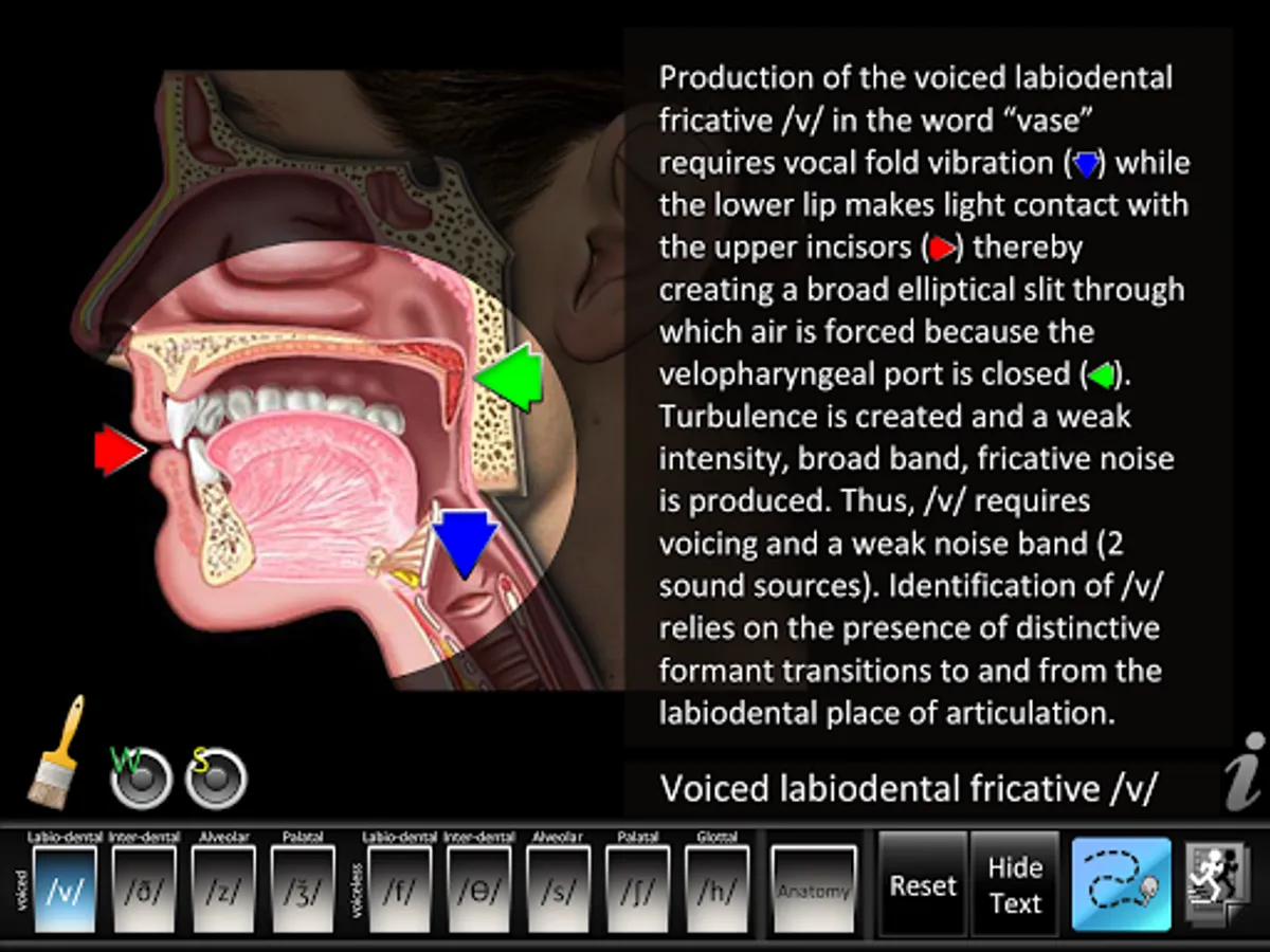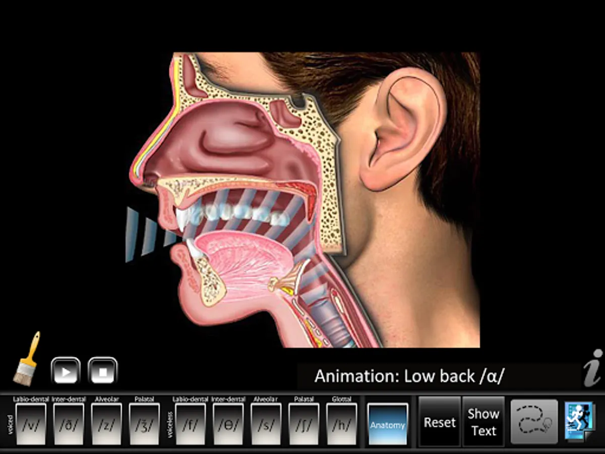 • Animations: each consonant shows a lateral view of dynamic movements of the jaw, lips, tongue, velum (soft palate), and larynx needed for proper articulation of that consonant. Audio for each consonant sound is synchronized with the dynamic animations. Anatomy animation included.