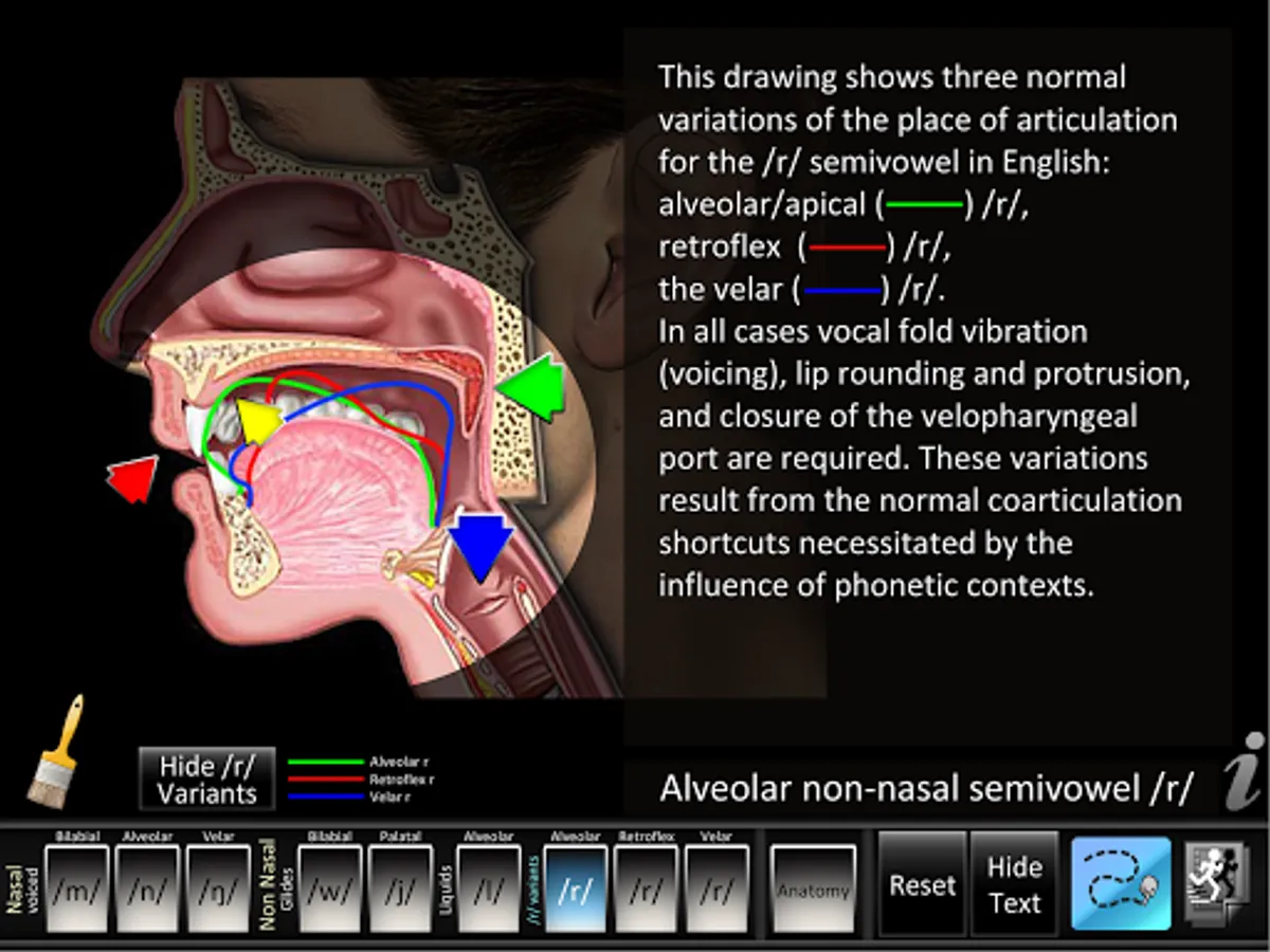 - Includes a 3 /r/ variant overlay illustration comparing the aveolar, redtroflex and velar place of articulation.