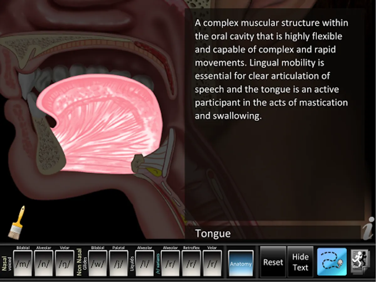 • Animations: each consonant shows a lateral view of dynamic movements of the jaw, lips, tongue, velum (soft palate), and larynx needed for proper articulation of that consonant. Audio for each consonant sound is synchronized with the dynamic animations. Anatomy animation included.