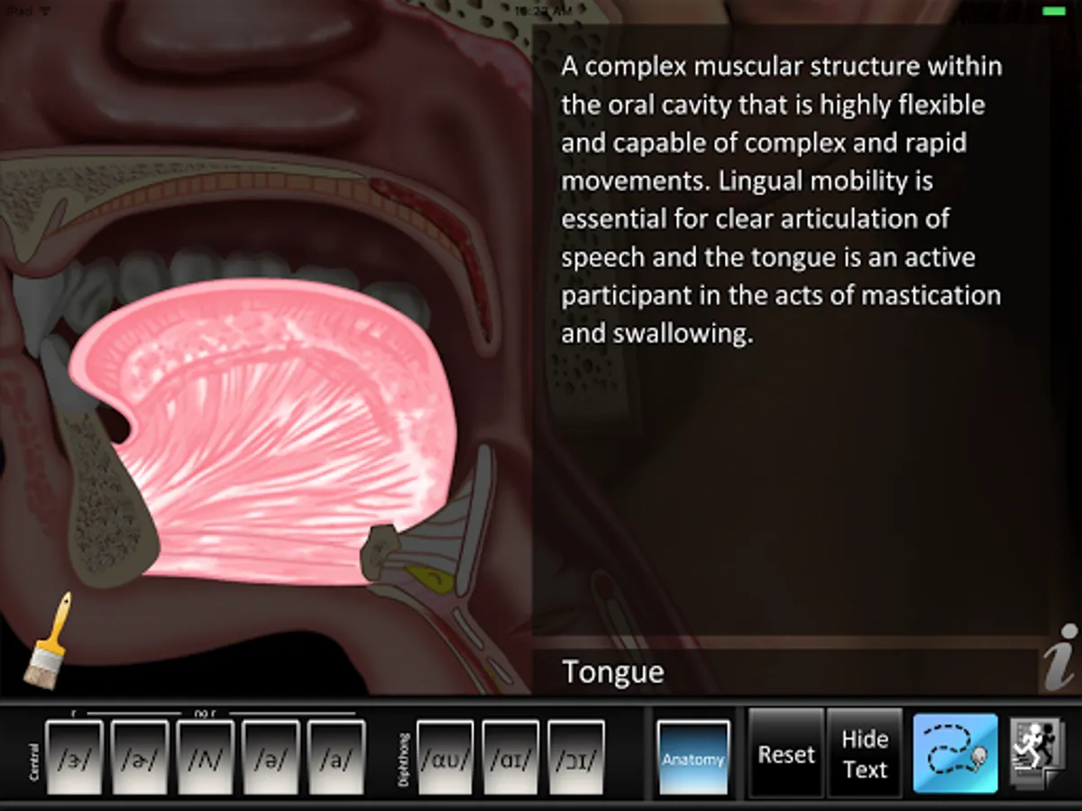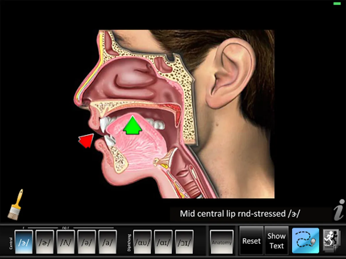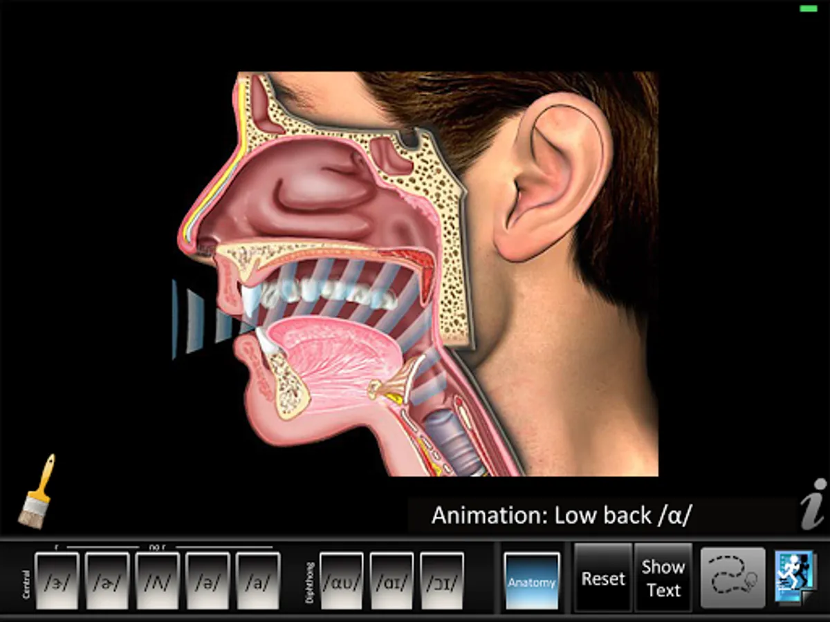 • Animations: each vowel shows a lateral view of dynamic movements of the jaw, lips, tongue, velum (soft palate), and larynx needed for proper articulation of that vowel. Audio for each vowel sound is synchronized with the dynamic animations. Anatomy animation included.