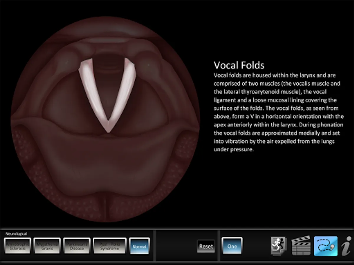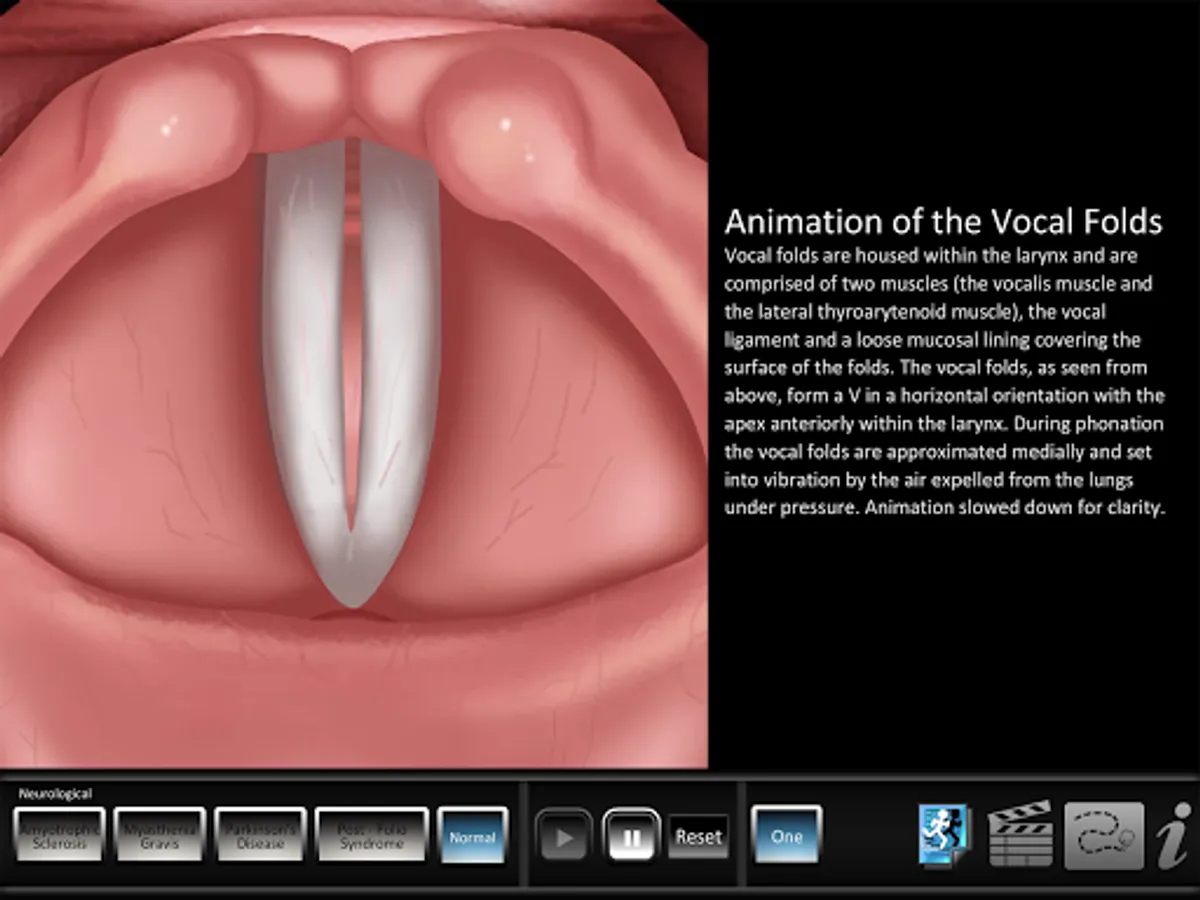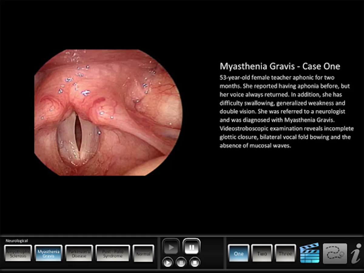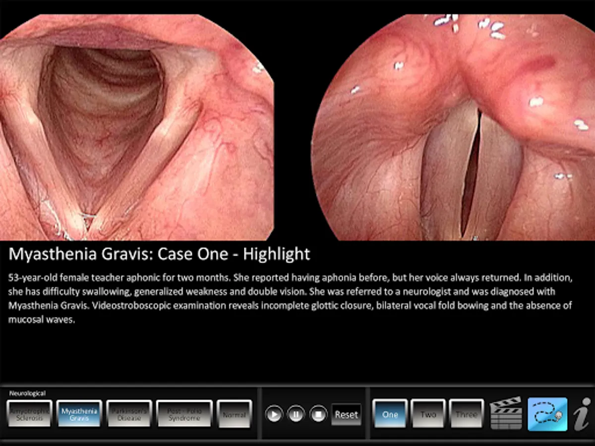 The Neurological app helps students and patients learn and professionals teach vocal pathologies. The app features Amyotrophic Lateral Sclerosis, Myasthenia Gravis, Parkinson's Disease, Post Polio Syndrome and normal videos. Each disorder case includes a key highlight view of abducted and adducted vocal folds. All disorders and normal video include an audio clip of the patient reading the rainbow passage. A normal animated vocal fold illustration, structure ID and three normal videos help patients and students both learn and contrast pathologies against normal vocal folds.