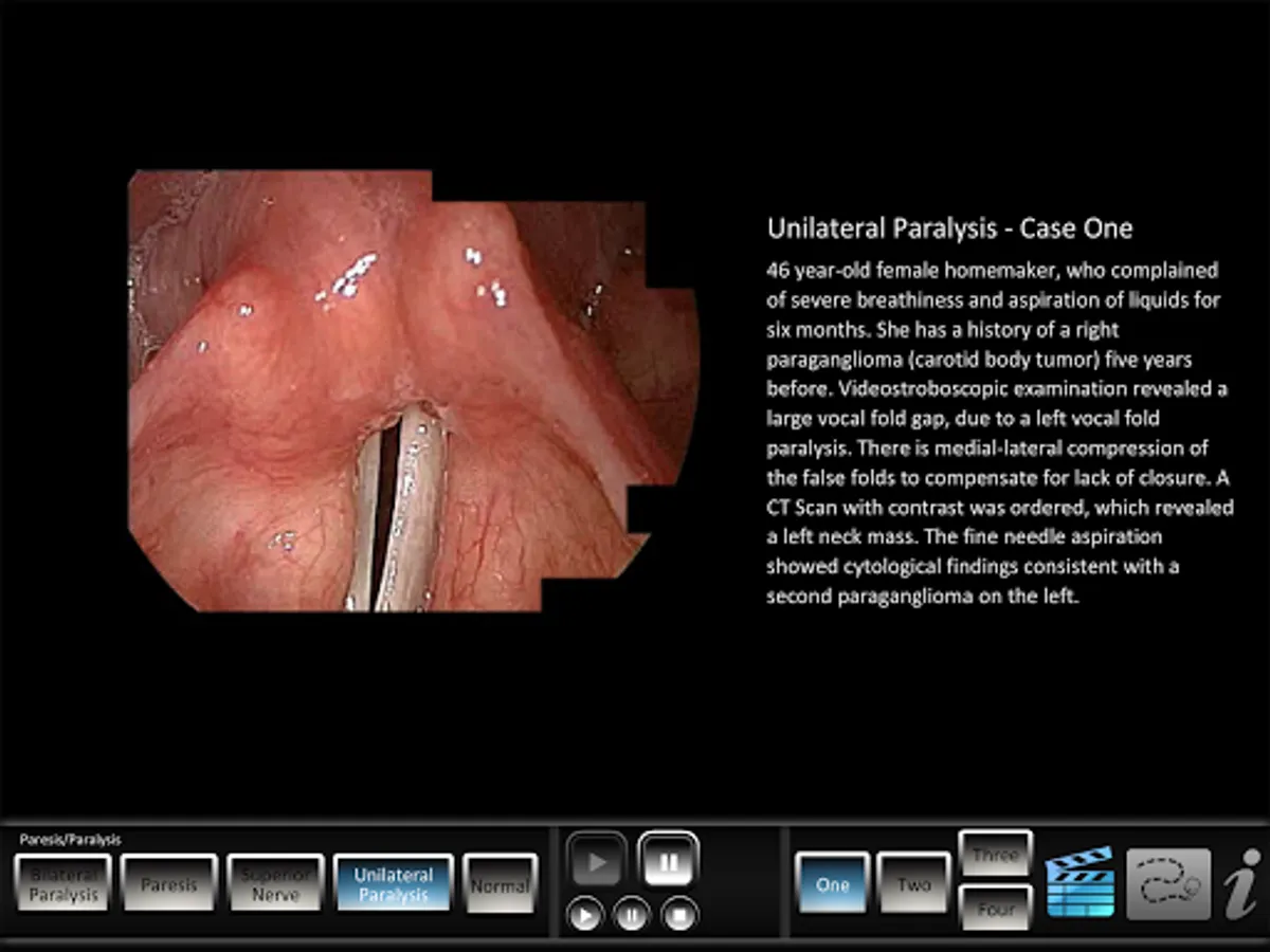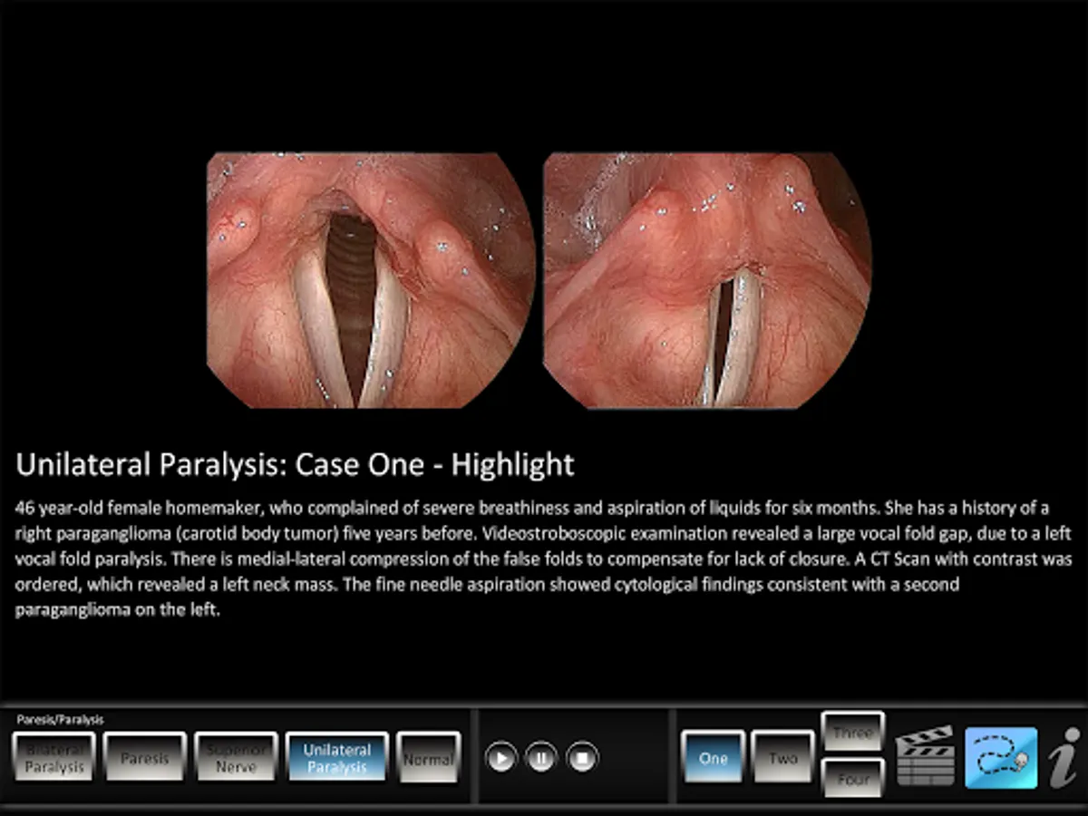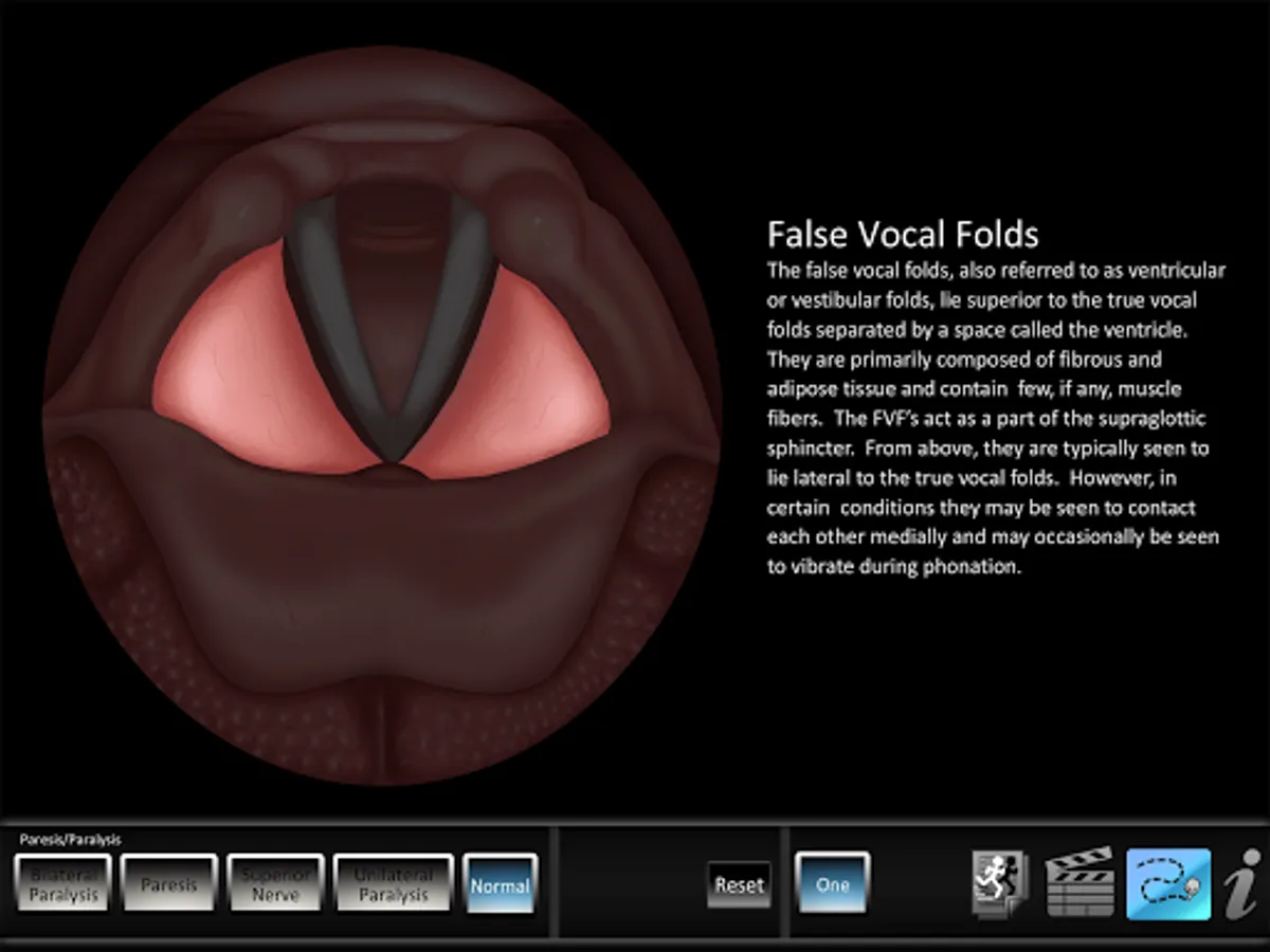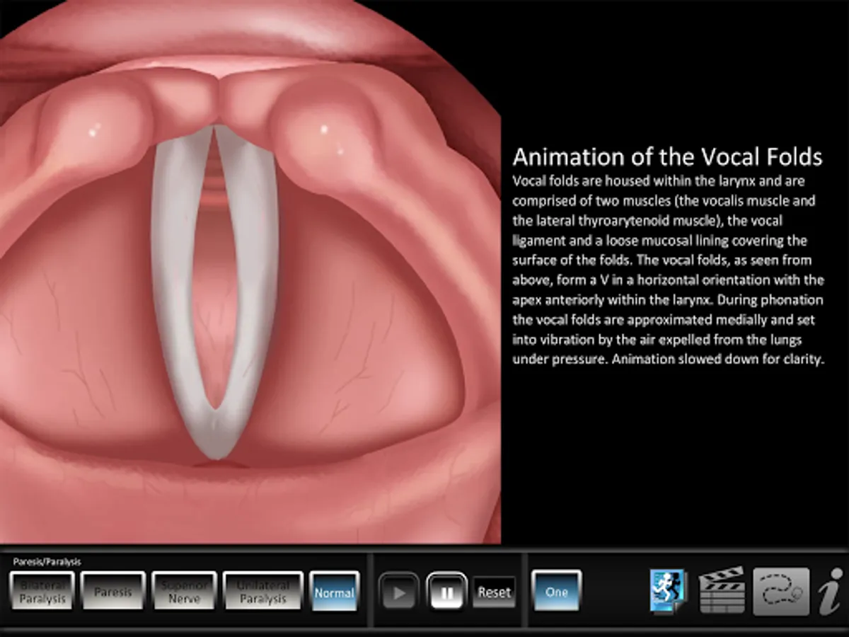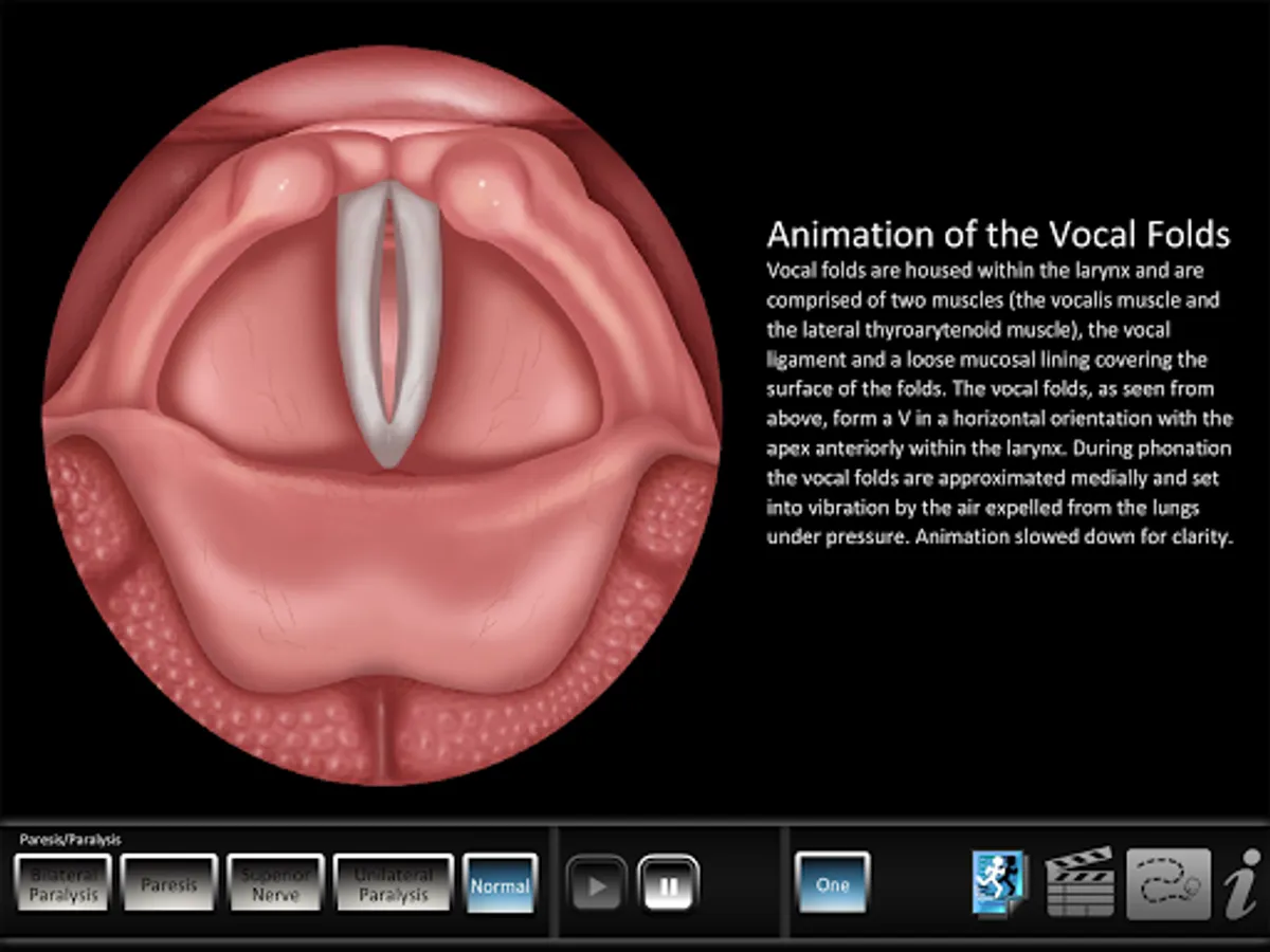 Paresis Paralysis app helps students and patients learn and professionals teach vocal pathology. The app features bilateral paralysis, paresis, superior nerve and unilateral videos. Each disorder case includes a key highlight view of abducted and adducted vocal folds. All disorders and normal video include an audio clip of the patient reading the rainbow passage. A normal animated vocal fold illustration, structure ID and three normal videos help patients and students both learn and contrast pathologies against normal vocal folds.